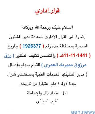 وتكليف الدكتور رزق مرزوق العمري ، للقيام بمهام وأعمال مساعد المدير التنفيذي للخدمات الطبية .