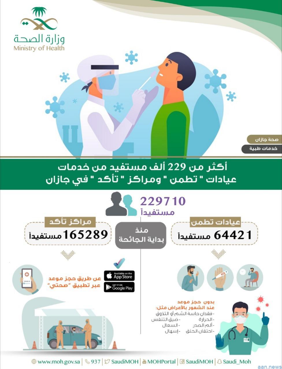 قدّمت عيادات “تطمن” ومراكز “تأكد” في منطقة جازان خدماتها لـ229710 مستفيدين منذ بدء العمل فيها حتى الآن.