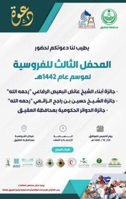 ينطلق غداً الخميس محفل الفروسية الثالث لسباق الخيل للعام الحالي، ضمن فعاليات مهرجان صيف العقيق 42، على جائزة أبناء الشيخ عائض البعيص الرفاعي “رحمه الله” وجائزة الشيخ حسين بن راجح الزائعي “رحمه الله” وجائزة الدوائر الحكومية بمحافظة العقيق وذلك بميدان فروسية العقيق بالباحة.