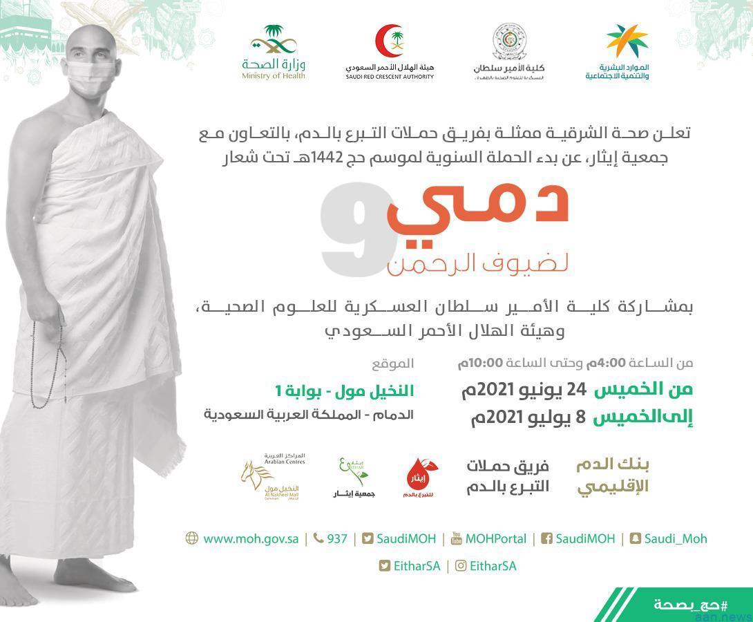 نظمت صحة الشرقية ممثلة بفريق حملات التبرع بالدم بالتعاون مع جمعية إيثار وكلية الأمير سلطان العسكرية للعلوم الصحية والهلال الأحمر السعودي، الحملة التطوعية السنوية للتبرع بالدم بعنوان ” دمي لضيوف الرحمن” وذلك لموسم حج 1442