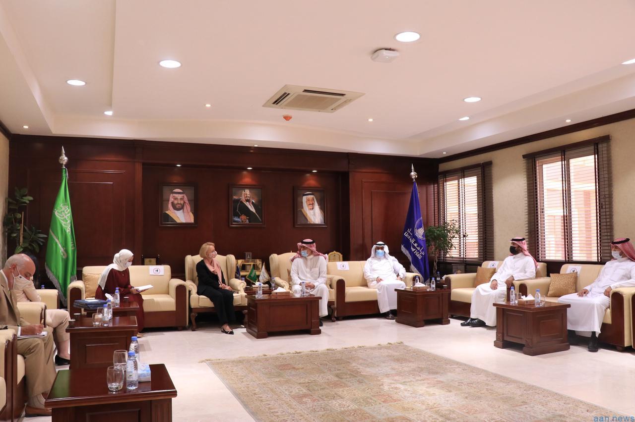 وفي بداية اللقاء رحب وكيل الجامعة للتطوير والأعمال، بالقائمة بأعمال سفارة الولايات المتحدة الأمريكية لدى المملكة، مارتينا سترونغ والوفد المرافق، مقدراً لها هذه الزيارة، و مبيناً أن الجامعة تحرص على توطيد وبناء العلاقات والاستفادة من البرامج ذات العلاقة في الجوانب الأكاديمية والعلمية والبحثية، كما تعمل على فتح آفاق جديدة في ظل ما تحظى به الجامعة من دعم من لدن خادم الحرمين الشريفين الملك سلمان بن عبدالعزيز، وسموّ ولي عهده الأمين، الأمير محمد بن سلمان بن عبدالعزيز- حفظهما الله-.