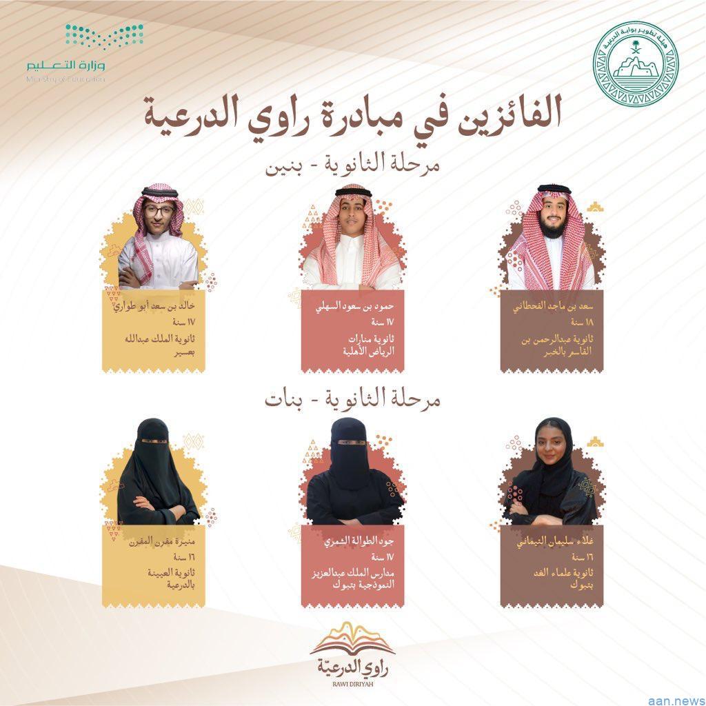 من (ثانوية مدارس علماء الغد) بعد فوزهما ضمن 12 فائزًا وفائزة من طلاب وطالبات مدارس المملكة في مسابقة راوي الدرعية تم تتويجهم في الحفل الذي أقيم بالقرب من قصر سلوى الشامخ في حي الطريف التاريخي من مختلف مناطق المملكة ومن مختلف الأعمار، والمراحل الدراسية بهدف غرس المبادئ والقيم الوطنية، وتعزيز الانتماء الوطني لدى الطلاب وإحياء واستذكار التراث العريق للدرعية، من خلال سرد تاريخي وأدبي جذاب لثلاثٍ وثلاثين قصة، مرتبطة بتاريخ المملكة وتراثها، بما فيه من شخصيات وطنية وبطولية وأحداث تاريخية، بإشراف متخصصين من هيئة تطوير بوابة الدرعية ووزارة التعليم.
