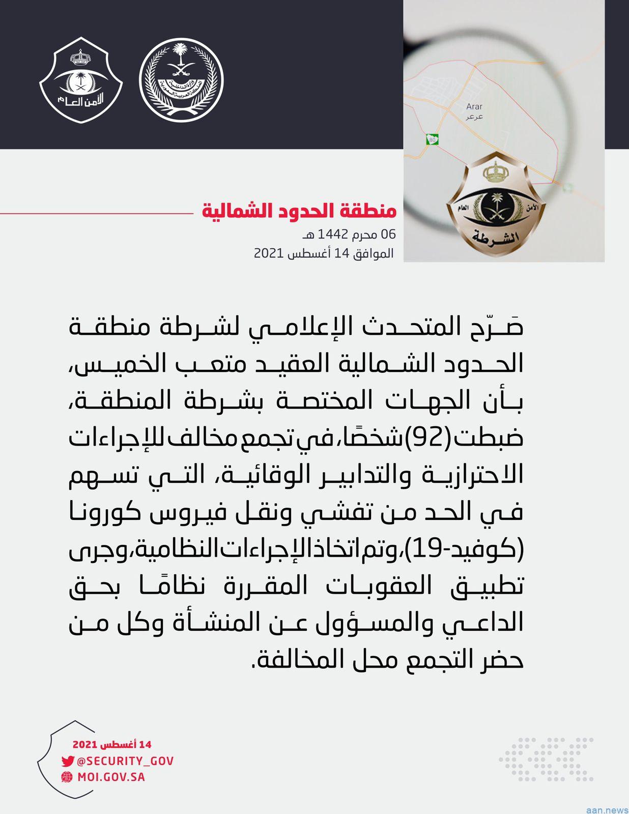 صَرّح المتحدث الإعلامي لشرطة منطقة الحدود الشمالية العقيد متعب الخميس، بأن الجهات المختصة بشرطة المنطقة، ضبطت (92) شخصًا، في تجمع مخالف للإجراءات الاحترازية والتدابير الوقائية، التي تسهم في الحد من تفشي ونقل فيروس كورونا (كوفيد 19)، وتم اتخاذ الإجراءات النظامية، وجرى تطبيق العقوبات المقررة نظامًا بحق الداعي والمسؤول عن المنشأة وكل من حضر التجمع محل المخالفة.