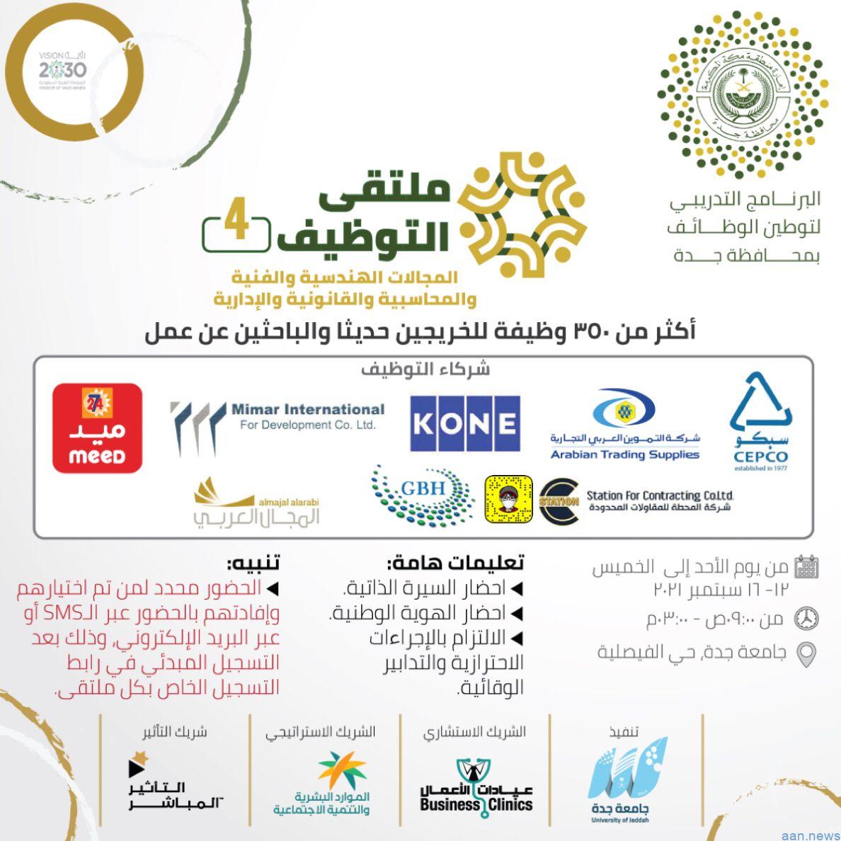 انطلقت فعاليات ملتقى التوظيف الرابع والذي يقام ضمن فعاليات البرنامج التدريبي لتوطين الوظائف بمحافظة جدة بدعم من محافظة جدة وبتنفيذ جامعة جدة وبشراكة استشارية من عيادات الأعمال وبشراكة استراتيجية من وزارة الموارد البشرية والتنمية الاجتماعية وبشراكة من التأثير المباشر، ويمتد لمدة 5 أيام بمقر البرنامج بجدة.