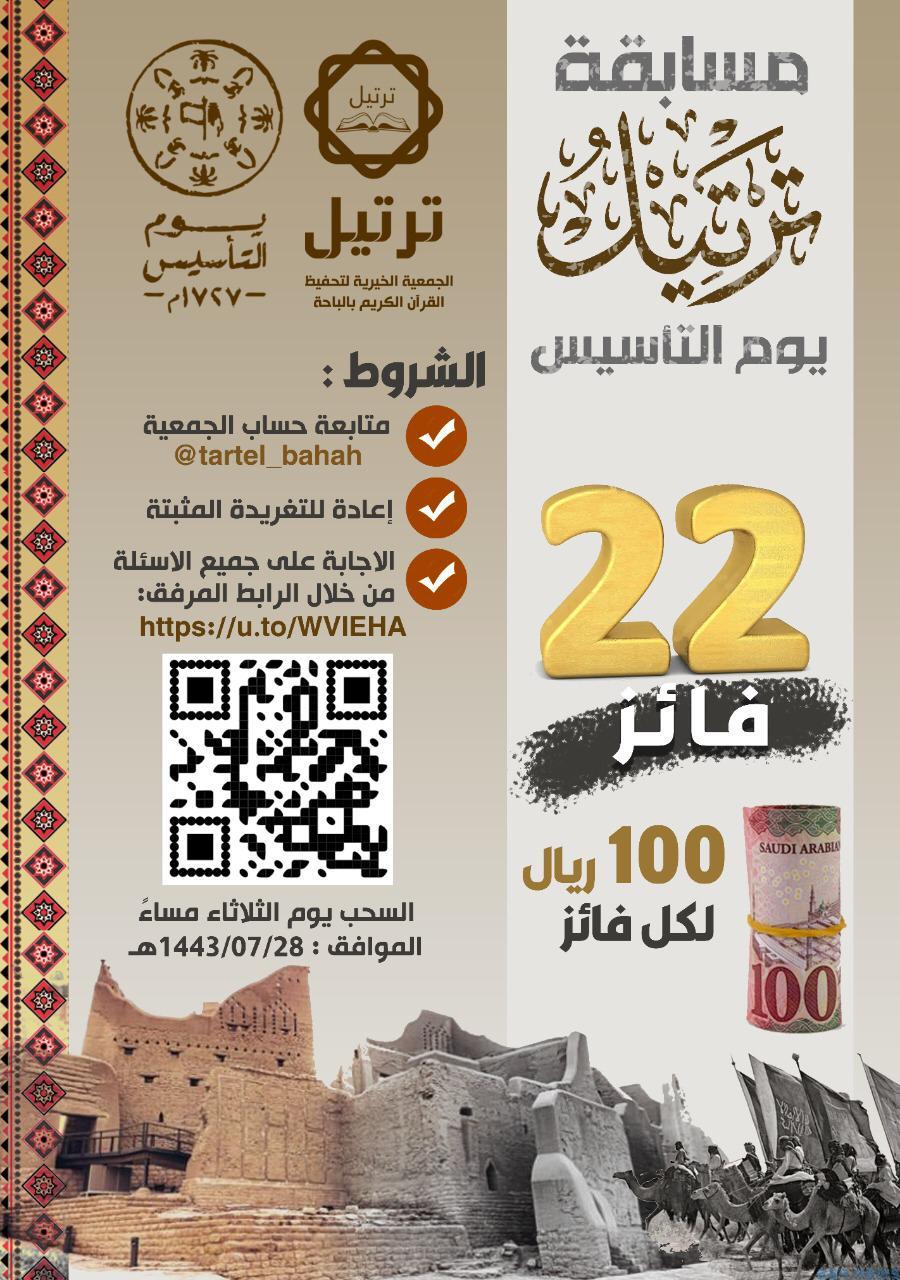 أطلقت جمعية ترتيل لتحفيظ القرآن الكريم بالباحة مسابقةً قرآنية بمناسبة يوم التأسيس الذي يوافق غدًا الثلاثاء الموافق ٢٢ فبراير ٢٠٢٢م .