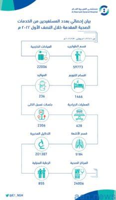 قدمت المنشآت والاقسام الصحية بقطاع النعيرية الصحي – احد مكونات تجمع الشرقية الصحي – خدمات طبية متكاملة لـ 105785 مراجعا خلال النصف الأول من هذا العام .