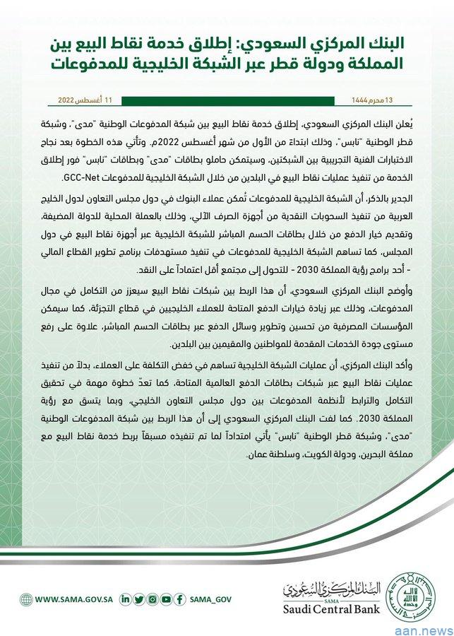 #البنك_المركزي: إطلاق خدمة نقاط البيع بين المملكة وقطر عبر الشبكة الخليجية للمدفوعات.
