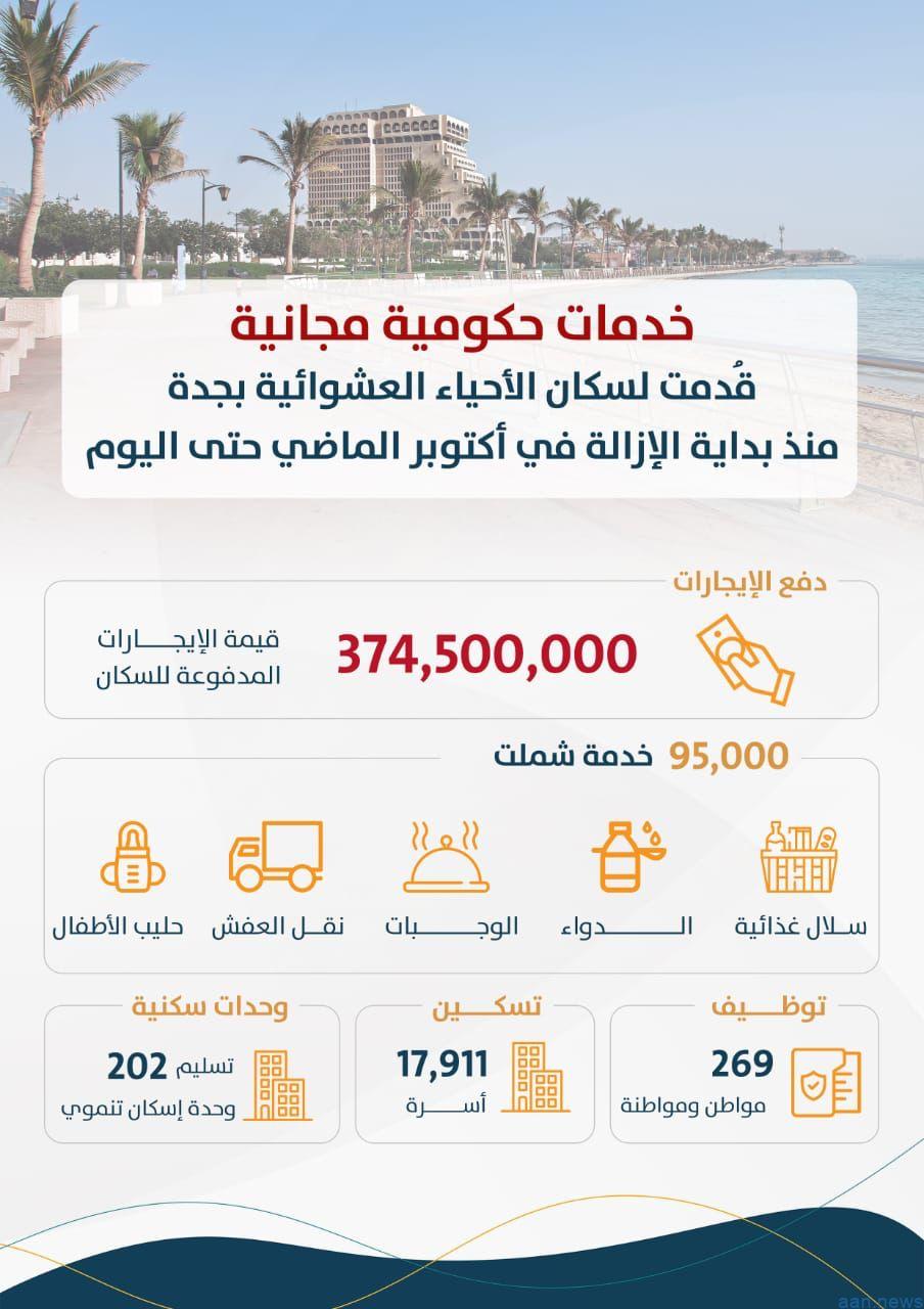 أعلنت لجنة الأحياء العشوائية بمحافظة جدة أنه تم دفع الإيجار لما يزيد عن 17 ألف أسرة من سكان الأحياء العشوائية بقيمة تقدر بــ 374 مليوناً و500 ألف ريال.