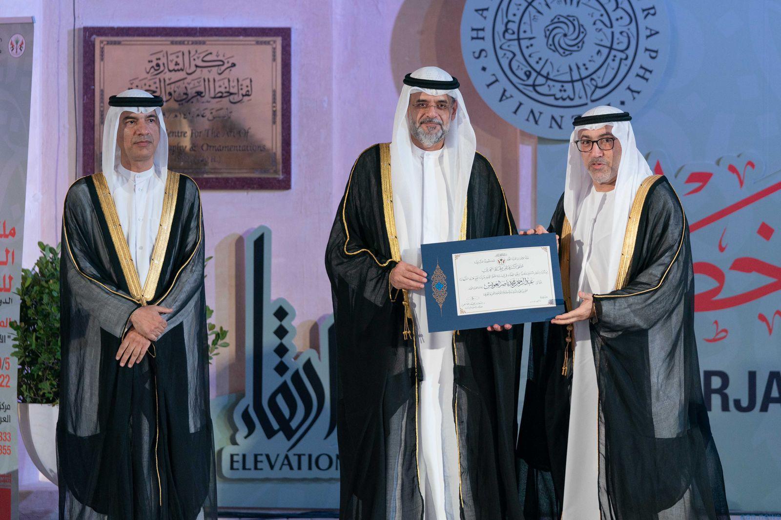بعدها تفضل سمو ولي العهد نائب حاكم الشارقة بتكريم عدد من الفنانين من الشخصيات التي قدمت الكثير إلى فن الخط العربي، وهم: معالي عبد الرحمن بن محمد العويس، والفنان حمدي زايد، والخطاط صادق الدوري.