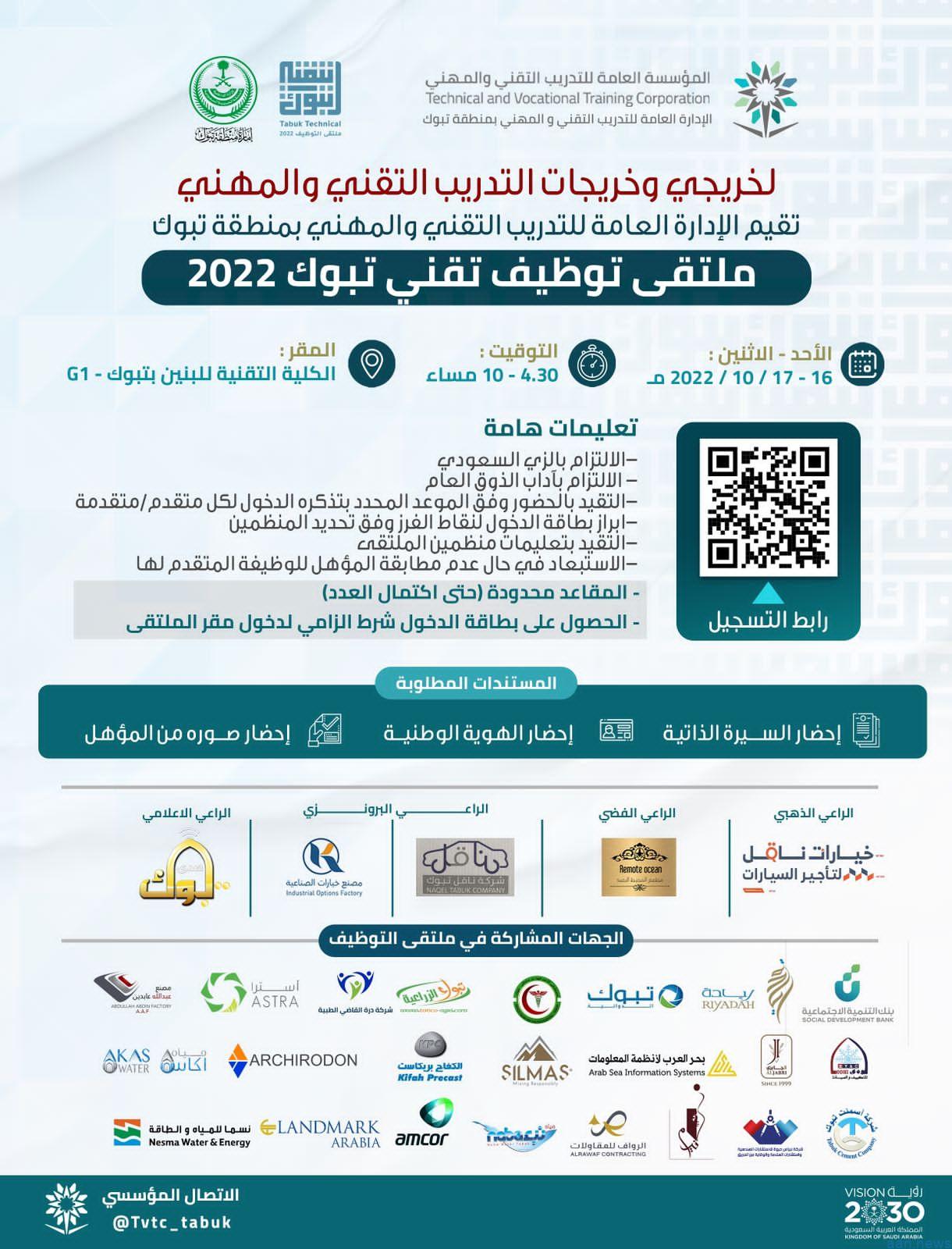 تُنظّم الإدارة العامة للتدريب التقني والمهني بمنطقة تبوك “ملتقى توظيف تقني تبوك 2022م”؛ لطرح عدد من الفرص الوظيفية لخريجي الكليات التقنية والمعاهد الصناعية، بمشاركة عدد من الشركات والمؤسسات الكبرى بالمنطقة، وذلك في مقر الكلية التقنية للبنين بمدينة تبوك.