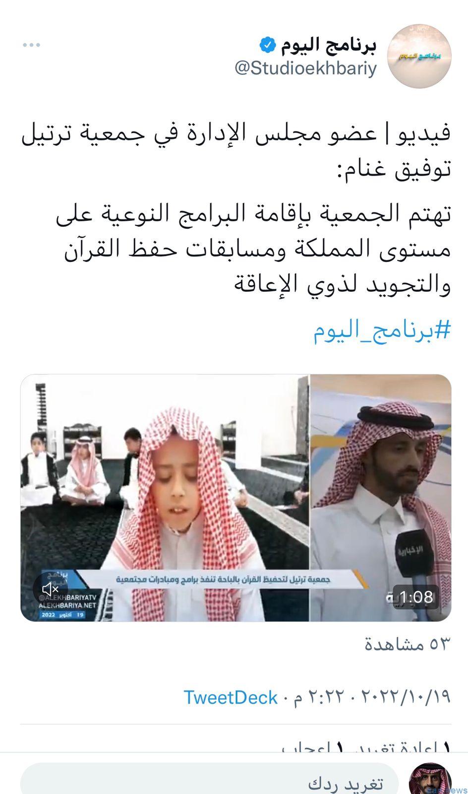 تحدث عضو مجلس إدارة جمعية ترتيل لتحفيظ القرآن الكريم بالباحة والمسؤول الإعلامي الأستاذ توفيق محمد غنام عبر برنامج اليوم الذي يعرض مباشرةً بقناة الإخبارية السعودية ؛ عن إنجازات جمعية ترتيل منذ نشأتها قبل زهاء ثلاثين عامًا ، والتي تمخضت عن تخريج الكثير من الحفاظ والحافظات الذين مثلوا المنطقة والجمعية في المسابقات المحلية والدولية خير تمثيل تحت ظل ورعاية قادة بلادنا منذ ذلك الوقت حتى عهدنا الزاهر .