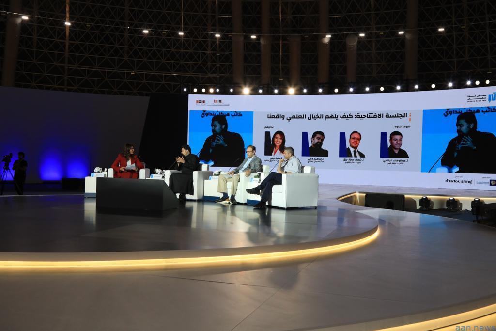 وحملت جلسة الافتتاح عنوان “كيف يلهم الخيال العلمي واقعنا”، تناول المشاركون خلالها مفهوم الخيال العلمي، وارتباطه بالواقع، مستشهدين بأمثلة واقعية لخيالات علمية كُتب عنها في الألفية الأولى، وتحققت في الألفية الثانية، حيث افتتحت الجلسة بمقدمة تعريفية عن الخيال العليمي، ونبذة عن سيرة الضيوف، قدمتها الأكاديمية والمذيعة في قناة الشرق السعودية مايا حجيج، طارحة على المحاضرين عددًا من الأسئلة المتمحورة حول العلم والخيال العلمي.