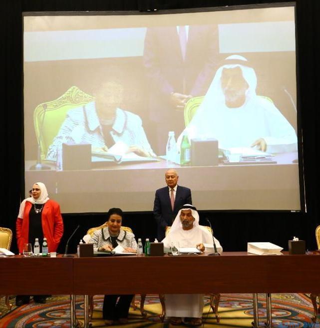 شهد الأمين العام لجامعة الدول العربية احمد ابو الغيط مراسم توقيع بروتوكول تعاون مشترك بين كلا من احمد الجروان رئيس مجلس التسامح والسلام العالمي وبين الدكتورة مايسة الهاشمي رئيس الاتحاد العربي للعمل الانساني والتنميه المستدامه عضو ملتقى الاتحادات بجامعه الدول العربيه.