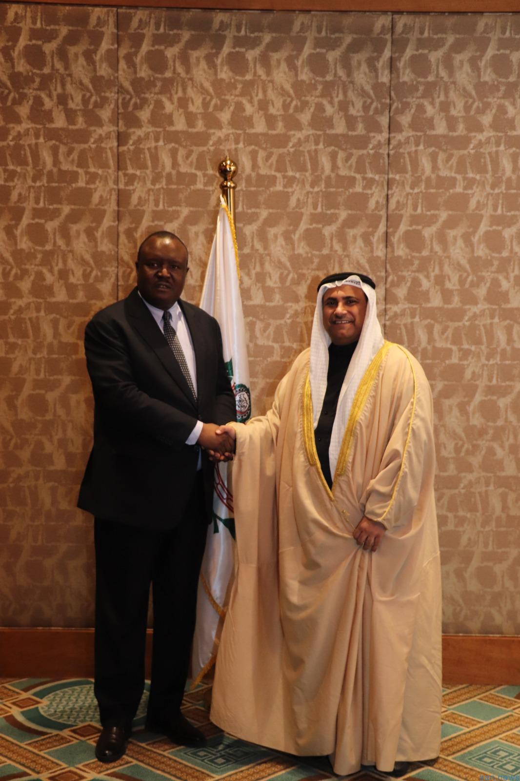 جاء ذلك خلال استقبال معالي رئيس البرلمان العربي معالي السيد فورتشن شارومبيرا رئيس برلمان عموم أفريقيا والوفد المرافق له بالقاهرة؛ حيث قدم له الشكر لتلبيته الدعوة والمشاركة كضيف شرف في المؤتمر الخامس للبرلمان العربي ورؤساء المجالس والبرلمانات العربية الذي نظمه البرلمان العربي في مقر جامعة الدول العربية بالقاهرة.