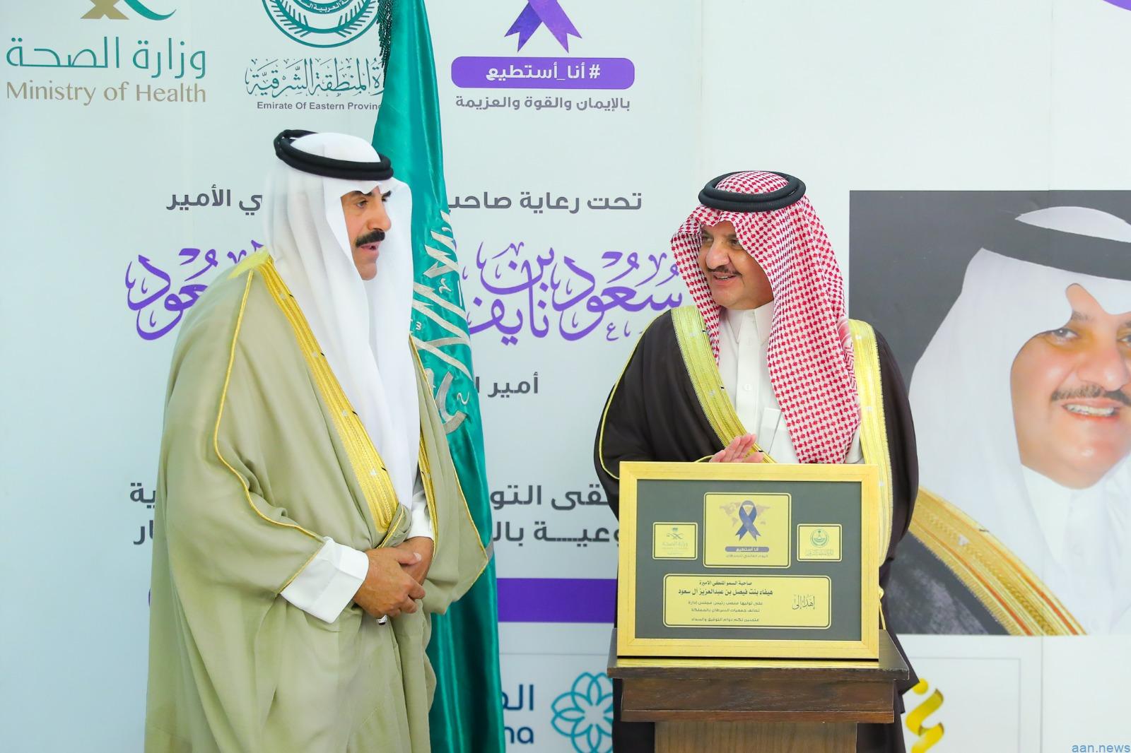 وكرم سمو أمير المنطقة الشرقية خلال التدشين الضيوف والمشاركين والرعاة بملتقى أنا أستطيع، وهم : سمو الأميرة هيفاء الفيصل بمناسبة فوزها بانتخابات رئاسة تحالف جمعيات السرطان بالمملكة وتسلم الدرع بالنيابةِ عنها اللواء قناص آل سوار أمين عام الجمعية، كما كرم سمو الأمير المتحدثين بالملتقى، الدكتور عبدالله الفوزان الأمين العام لمركز الملك عبد العزيز للحوار الوطني والدكتور فهد الخضيري وهوا عالم أبحاث طبية في السرطان، واستشارية اشعة الثدي والكشف المبكر عن السرطان دكتورة فاتنة الطحان، و الدكتورة لمياء البراهيم استشاري طب أسرة والملهم الدكتور حمد بن جروان ومقدمة الحفل أستاذ نهى الحربي، وعدد من ممثلي الجهات الحكومية والخاصة وشركاء النجاح والداعمين.