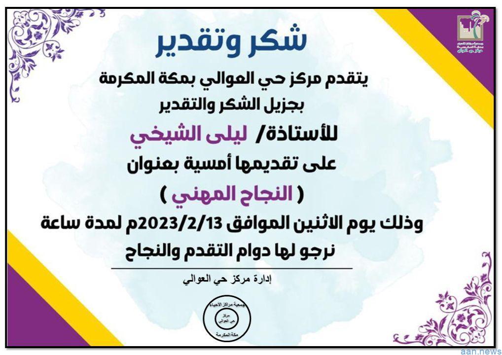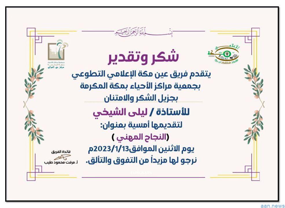 كرم مركز حي العوالي بجمعية مراكز الاحياء بمكة المكرمة وفريق عين مكة الإعلامي التطوعي بمنطقة مكة المكرمة الزميلة الإعلامية ليلى الشيخي لجهودها المبذولة والمتميزة جاء ذلك نظير مساهمتها وتقديمها أمسية بعنوان “النجاح المهني” ومشاركتها في العديد من الانشطة والبرامج إلتي تخدم المجتمع وبدورة عبرت الزميلة ليلى الشيخي عن أعتزازها وشكرها لهذا التكريم غير المستغرب وعن بالغ سعادتها بذلك التقدير مثمنة جهودهم في أنجاح برامج المركز