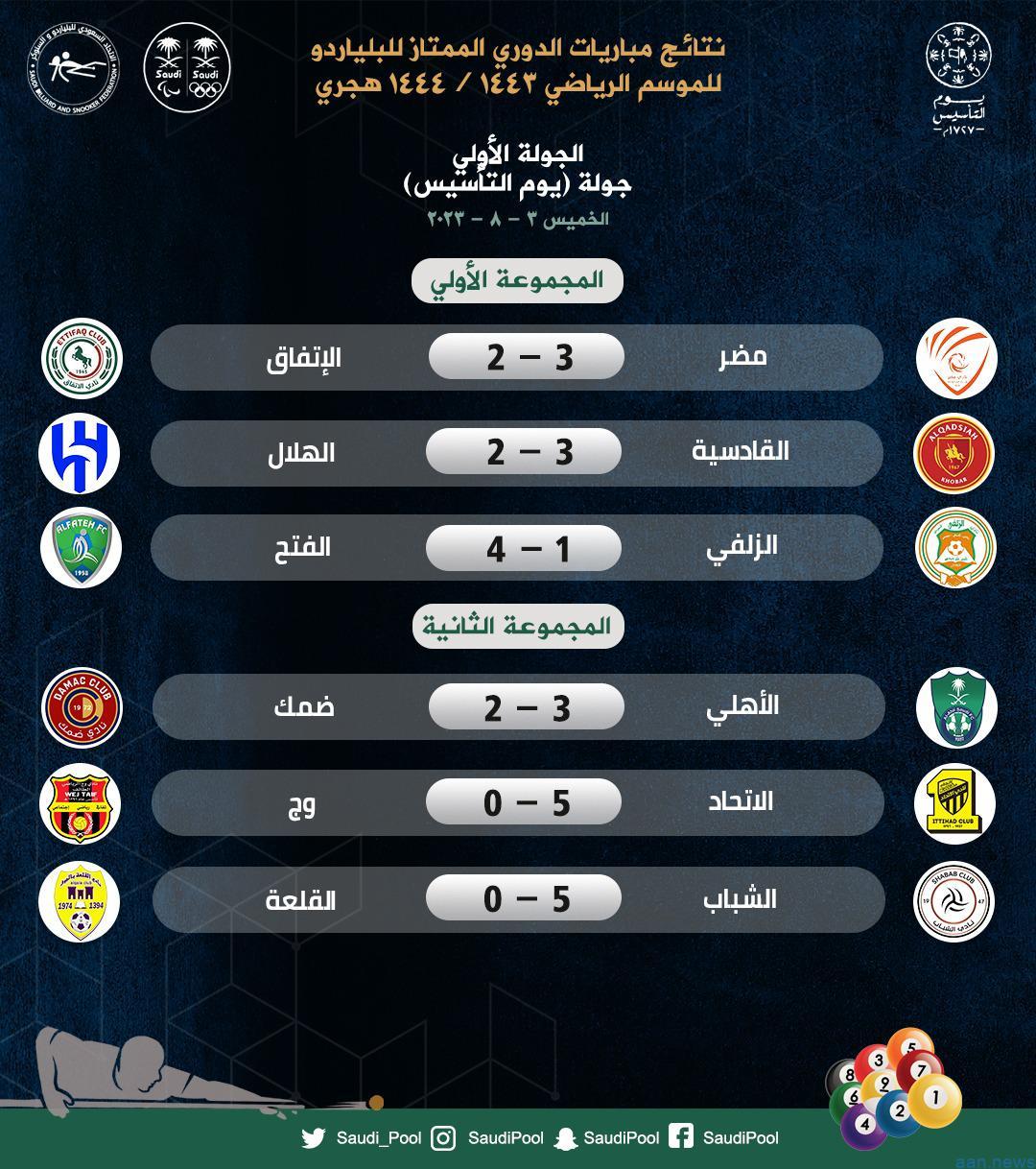 تمكن فريق نادي القادسية للبلياردو من الفوز على فريق نادي الهلال بنتيجة 3 مقابل 2 في اللقاء الذي جمع الطرفين اليوم الخميس على صالة نادي القادسية بالدمام ضمن مواجهات الجولة الأولى “جولة يوم التأسيس” من الدوري السعودي للأندية الممتازة للبلياردو والذي انطلقت منافساته للموسم الرياضي 2023 اليوم الخميس بإقامة 6 مواجهات حيث حقق فريق مضر على صالته الفوز على فريق الاتفاق بنتيجة 3 مقابل 2 وفاز فريق الفتح على مضيفه فريق الزلفي بنتيجة 4 مقابل 1.