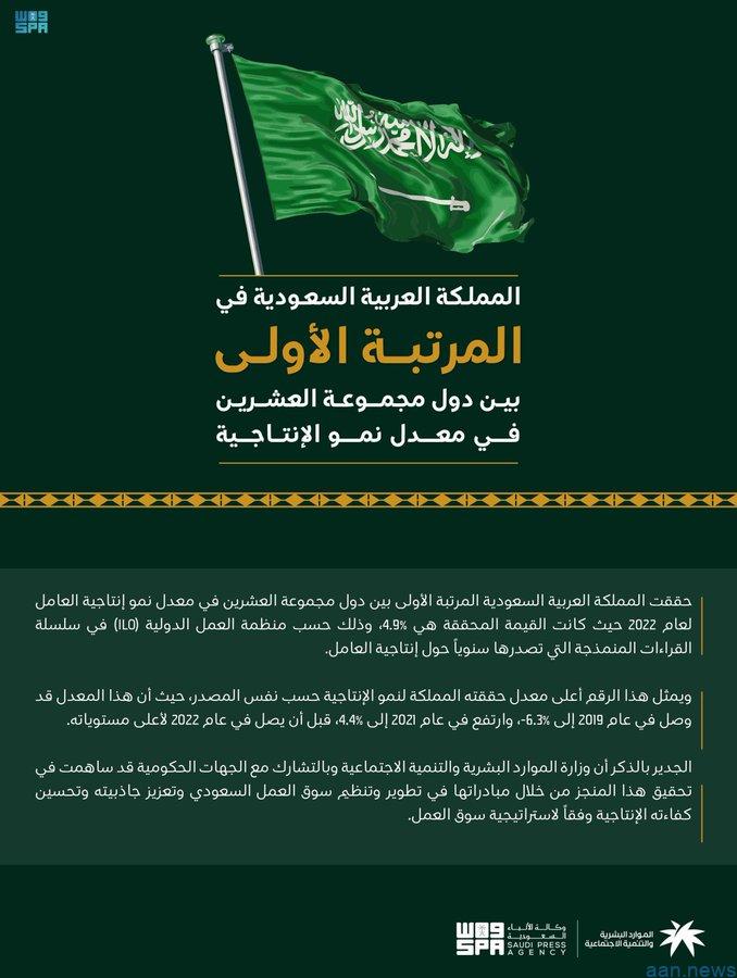 حققت المملكة العربية السعودية المرتبة الأولى بين دول مجموعة العشرين في معدل نمو إنتاجية العامل لعام 2022 حيث كانت القيمة المحققة هي %4.9، وذلك حسب منظمة العمل الدولية (ILO) في سلسلة القراءات المنمذجة التي تصدرها سنوياً حول إنتاجية العامل.