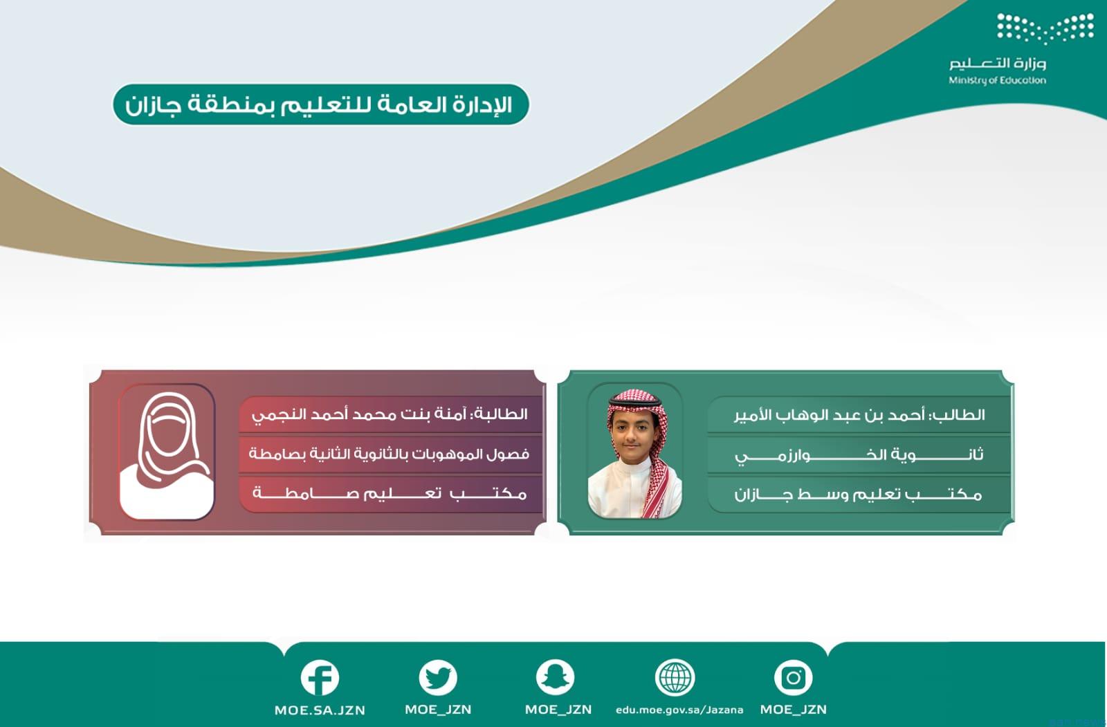 وحقق الطالب أحمد عبد الوهاب الأمير بالصف الأول الثانوي بثانوية الخوارزمي التابعة لمكتب وسط جيزان تصنيف موهبة استثنائية وهو أعلى تصنيف في المسابقة، حيث ستقدم له مؤسسة موهبة قبولا فوريا بعدد من برامجها أهمها برنامج التميز للالتحاق بالجامعات المرموقة والذي يجهز الطالب لبعثة موهبة لأعرق الجامعات العالمية، فيما حققت الطالبة آمنة محمد أحمد نجمي بالصف الأول الثانوي من فصول الموهوبات في الثانوية الثانية التابعة لمكتب تعليم صامطة تصنيف موهبة وهو التصنيف الثاني في المسابقة والتي ستقدم لها أيضا عدد من برامج المؤسسة الإثرائية أهمها برنامج موهبة الإثرائي العالمي.