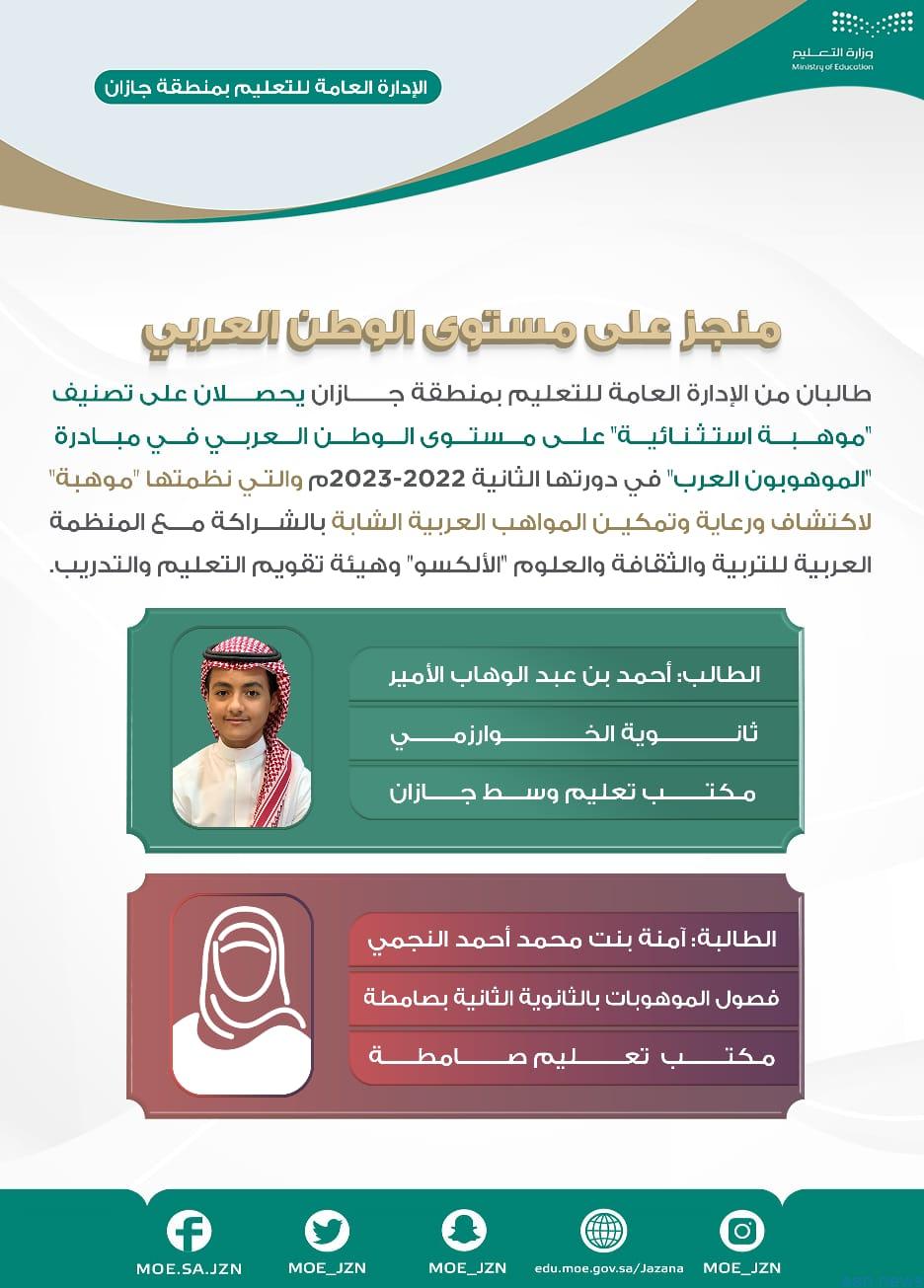 حققت الإدارة العامة للتعليم بمنطقة جازان على تصنيفين متقدمين على مستوى الوطن العربي في مبادرة الموهوبون العرب في دورتها الثانية 2022 – 2023م، والتي نظمتها مؤسسة الملك عبد العزيز ورجاله للموهبة والإبداع “موهبة”؛ لاكتشاف ورعاية وتمكين المواهب العربية الشابة، بالشراكة مع المنظمة العربية للتربية والثقافة والعلوم “الألكسو” وهيئة تقويم التعليم والتدريب، حيث حقق الطالب أحمد عبد الوهاب الأمير على تصنيف موهبة استثنائية والذي يعد أعلى تصنيف في المسابقة، فيما حققت الطالبة آمنة محمد نجمي على تصنيف موهبة وهو التصنيف الثاني في المسابقة.