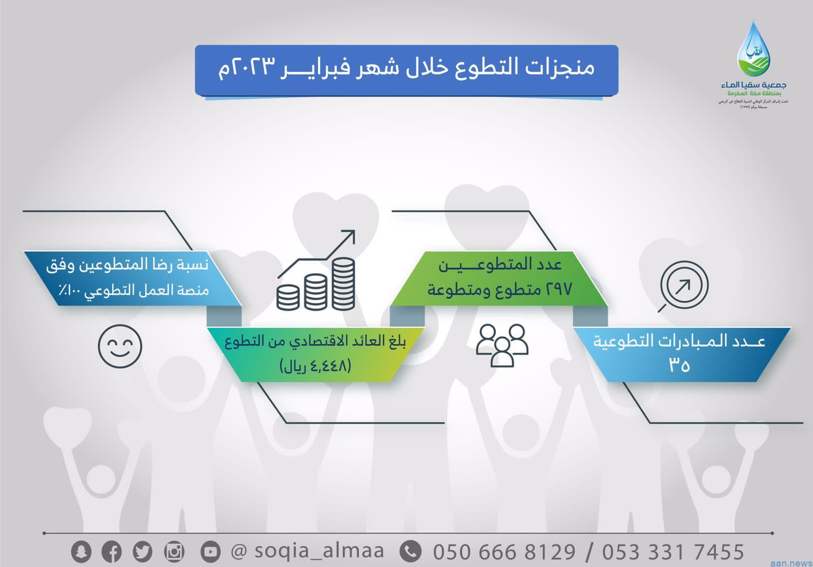 من جهته، ثمّن رئيس مجلس إدارة سقيا عايض بن عبدالله بن درهم جهود فريق العمل بالجمعية ومتطوعيها ، موضحاً أن الجمعية قدمت خلال فبراير 35 مبادرة تطوعية، شارك في تنفيذها 297 متطوعاً ومتطوعة نفذوا خلالها 1686 ساعة تطوعية ، في حين بلغ العائد الاقتصادي من التطوع 4448 ريال.