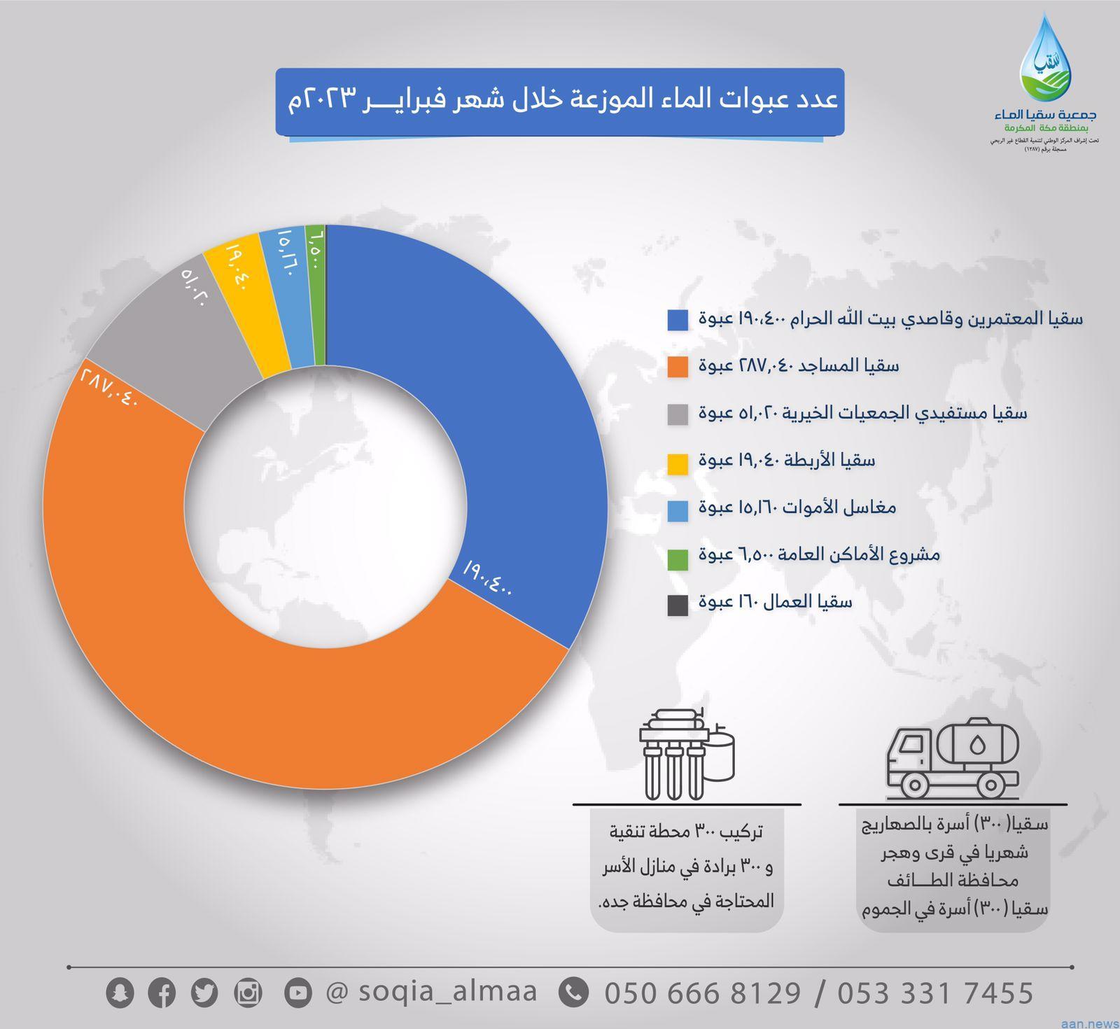 كشف تقرير جمعية سقيا الخيرية بمنطقة مكة المكرمة لشهر فبراير الماضي عن مواصلة الجمعية تنفيذ برامج سقيا المعتمرين وقاصدي بيت الله الحرام بتوفير المياه النقية والباردة وغيرها حيث بلغ ما تم توزيعه 582.920 عبوة ، وأكد التقرير توزيع 190.400 عبوة في محطات النقل ، و 287.040 عبوة في المساجد ، كما استفادت الأربطة من 19.040 عبوة ، وتم توزيع 51.020 عبوة لمستفيدي 10 جمعيات خيرية ، بينما تم تأمين مغاسل الموتى بـ 15.160 عبوة بالإضافة إلى توزيع 6500 عبوة في الاماكن العامة ، وسقيا 160 عامل.