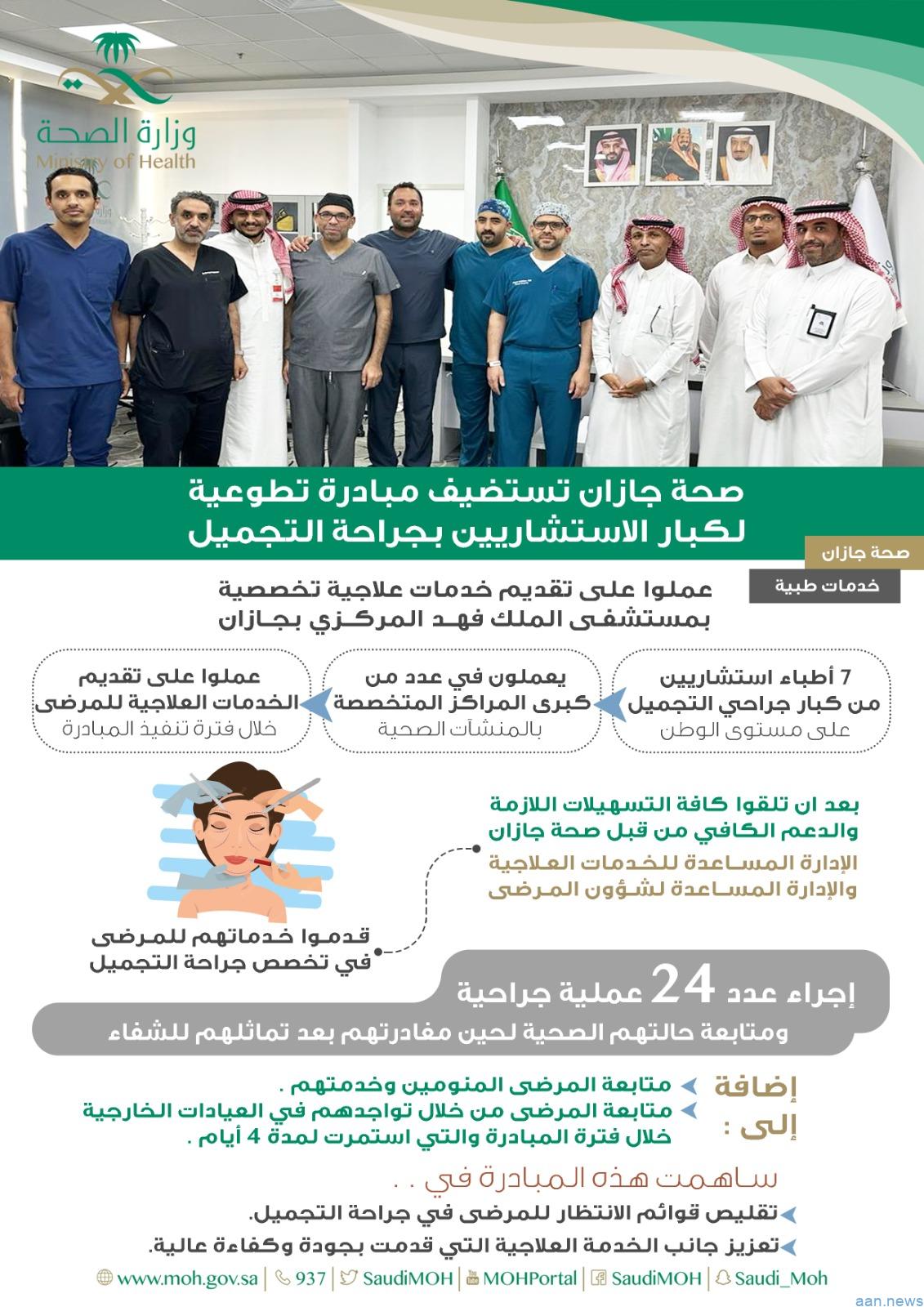 استضافت صحة جازان مبادرة تطوعية لمجموعة من كبار الأطباء الاستشاريين في تخصص جراحة التجميل والــذين عملوا على تقديـــم خدمات علاجية تخصصية بمستشفى الملك فهد المركزي بــجازان .