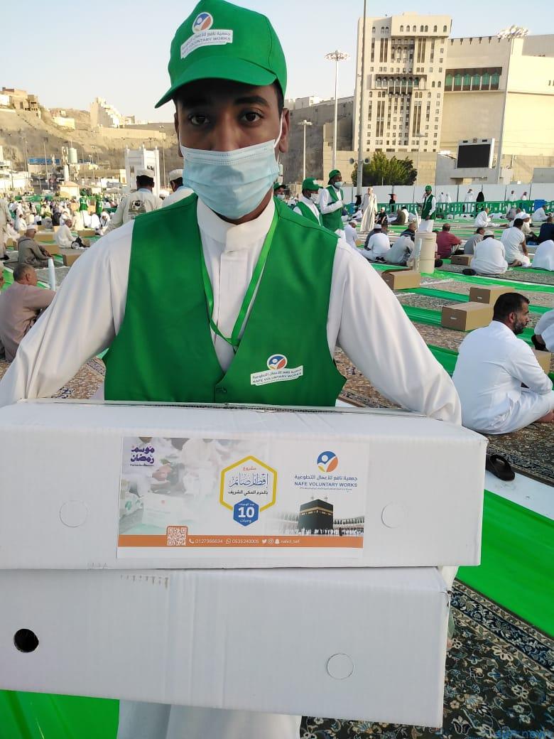 ومنهم جمعية نافع للأعمال التطوعية بالطائف من خلال وجبات إفطار صائم في ساحات المسجد الحرام