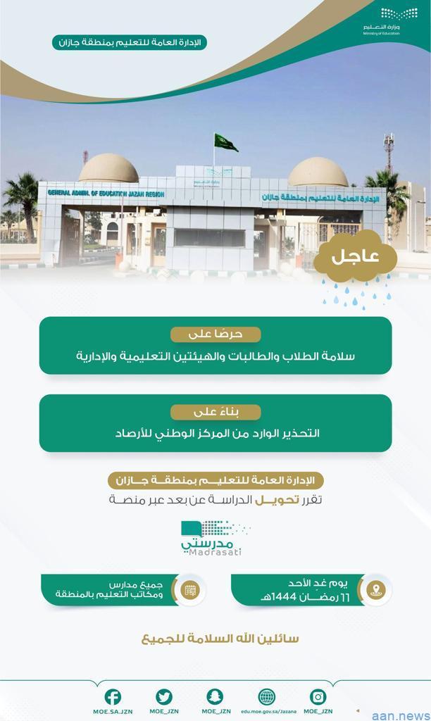 صرح المتحدث الإعلامي باسم #تعليم_جازان أن بناءً على مستجدات الحالة المطرية وحرصًا على سلامتكم فقد تقرر تحويل الدراسة غدًا الأحد عن بُعد عبر منصة مدرستي في جميع مكاتب #التعليم ومدارس الإدارة.