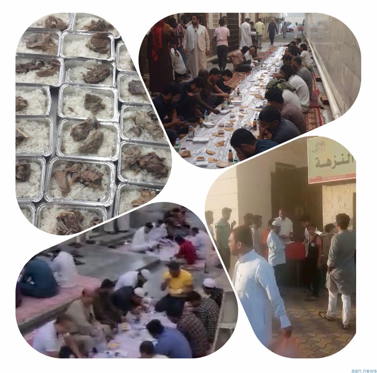 (٤٩٥٠٠) وجبة إفطار صائم عن طريق مندوبي التوزيع المتعاونين مع الوقف وفريق إهداء التطوعي التابع لمركز حي النزهة التابع لجمعية مراكز الأحياء بمكة المكرمة وقسم إدارة توزيع المواد الغذائية بالوقف