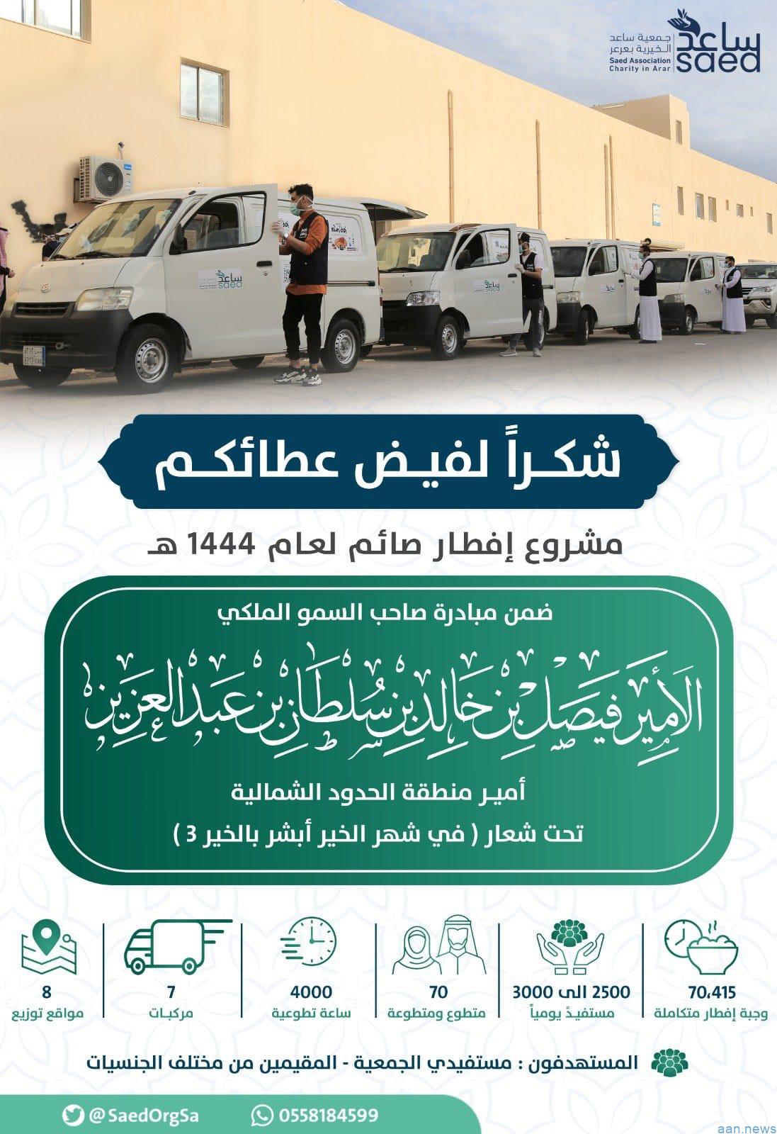 أقامت جمعية ساعد الخيرية بمدينة عرعر مشروع إفطار صائم حيث إن المشروع بدايته كانت منذوا 15 سنة وهو مشروع خيري ويتم أعداد الوجبات وتغليفها ويتم تسليمها للمستفيدين .