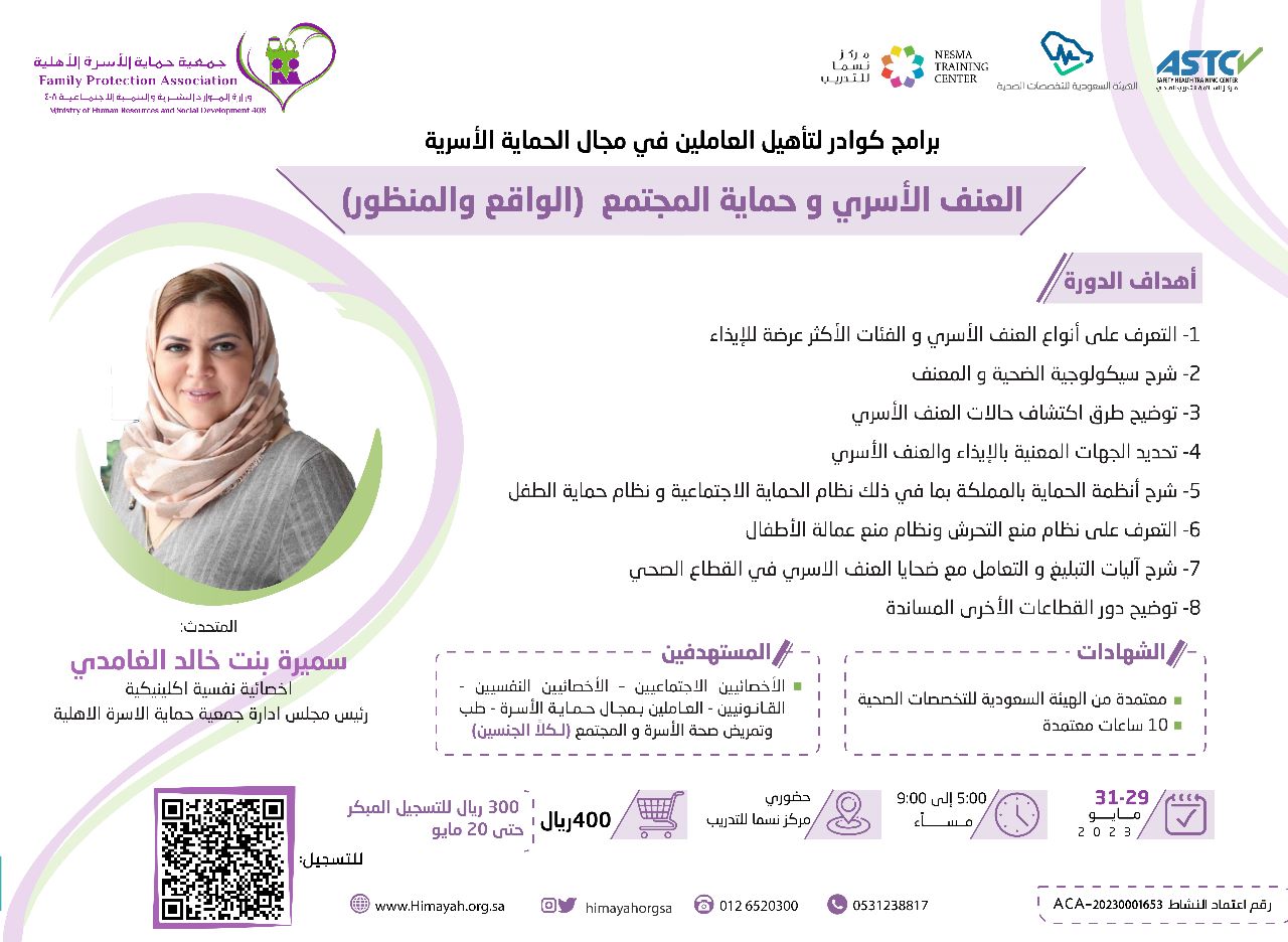 باعتماد الهيئة السعودية للتخصصات الصحية تعقد جمعية حماية الأسرة بالتعاون مع مركز السلامة للتدريب الصحي برنامج كوادر تحت عنوان “العنف الأسري وحماية المجتمع الواقع والمنظور” تقدمه رئيس مجلس الادارة سميره خالد الغامدي
