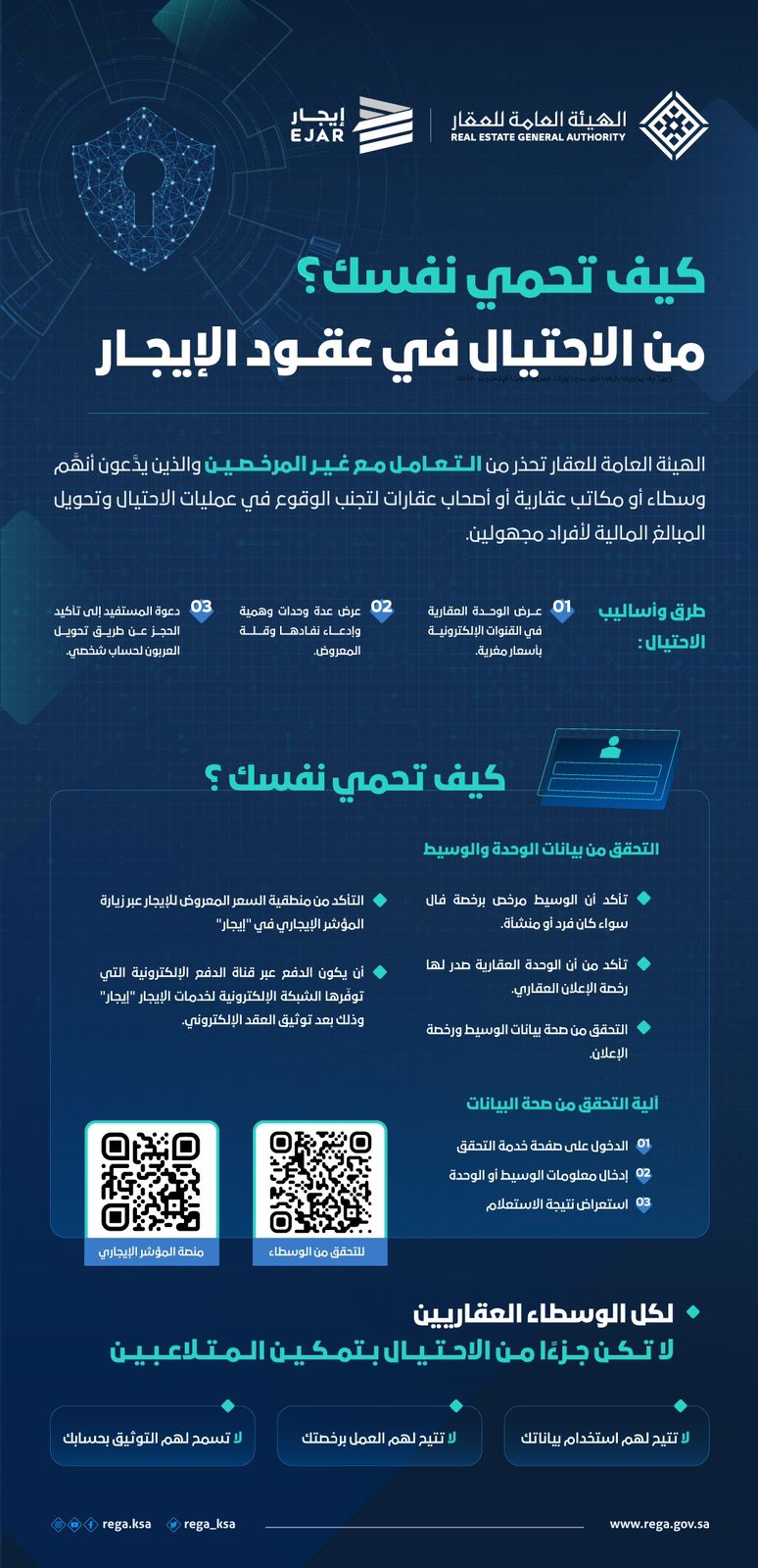 وأكّد المتحدث الرسمي للهيئة العامة للعقار تيسير المفرج على ضرورة التحقق ابتداءً من أنَّ الطرف المسوق للوحدة العقارية من الوسطاء المرخصين برخصة “فال ” العقارية سواءً كان فرد أو مُنشأة وأنَّ الوحدة العقارية قد صدر لها رخصة للإعلان العقاري صادرة من الهيئة العامة للعقار ، ثم التحقق من صحة بيانات الوسيط ورخصة الإعلان من خلال خاصية الاستعلام التي وفرتها الهيئة في منصة الخدمات الإلكترونية في موقعها عبر الرابط https://eservicesredp.rega.gov.sa/auth/queries وإدخال عدد من المعلومات مثل رقم رخصة الوسيط، أو رقم الهوية للفرد أو الرقم الموحد للمنشأة، أو اسم الوسيط، أو نوع الرخصة، لتظهر بعد ذلك نتيجة الاستعلام ، كما يمكن الاسترشاد بمنطقية السعر المعروض للإيجار عبر زيارة المؤشر الإيجاري في “إيجار” ؛ للتأكد من تماشي السعر المعروض مع النطاق السعري ومتوسط الأسعار للوحدة العقارية وفقًا لمواصفات الوحدة وموقعها ، وأنْ يكون تحويل الدفعة المالية عبرَ قناة الدفع الإلكترونية التي توفّرها الشبكة الإلكترونية لخدمات الإيجار “إيجار” www.ejar.sa ؛ وذلك بعد توثيق العقد الإلكتروني؛ والحذر من التحويل المالي للحسابات البنكية بشكل مباشر للحد من الوقوع في حالات التلاعب .