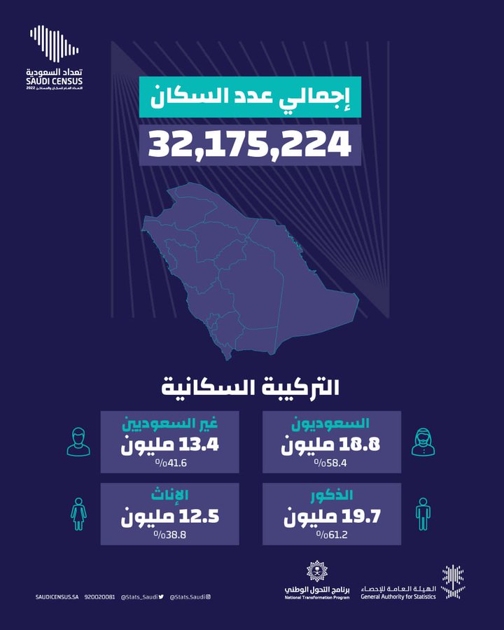 أعلنت الهيئة العامة للإحصاء اليوم أن عدد سكان المملكة العربية السعودية بلغ 32.175.224 نسمة.