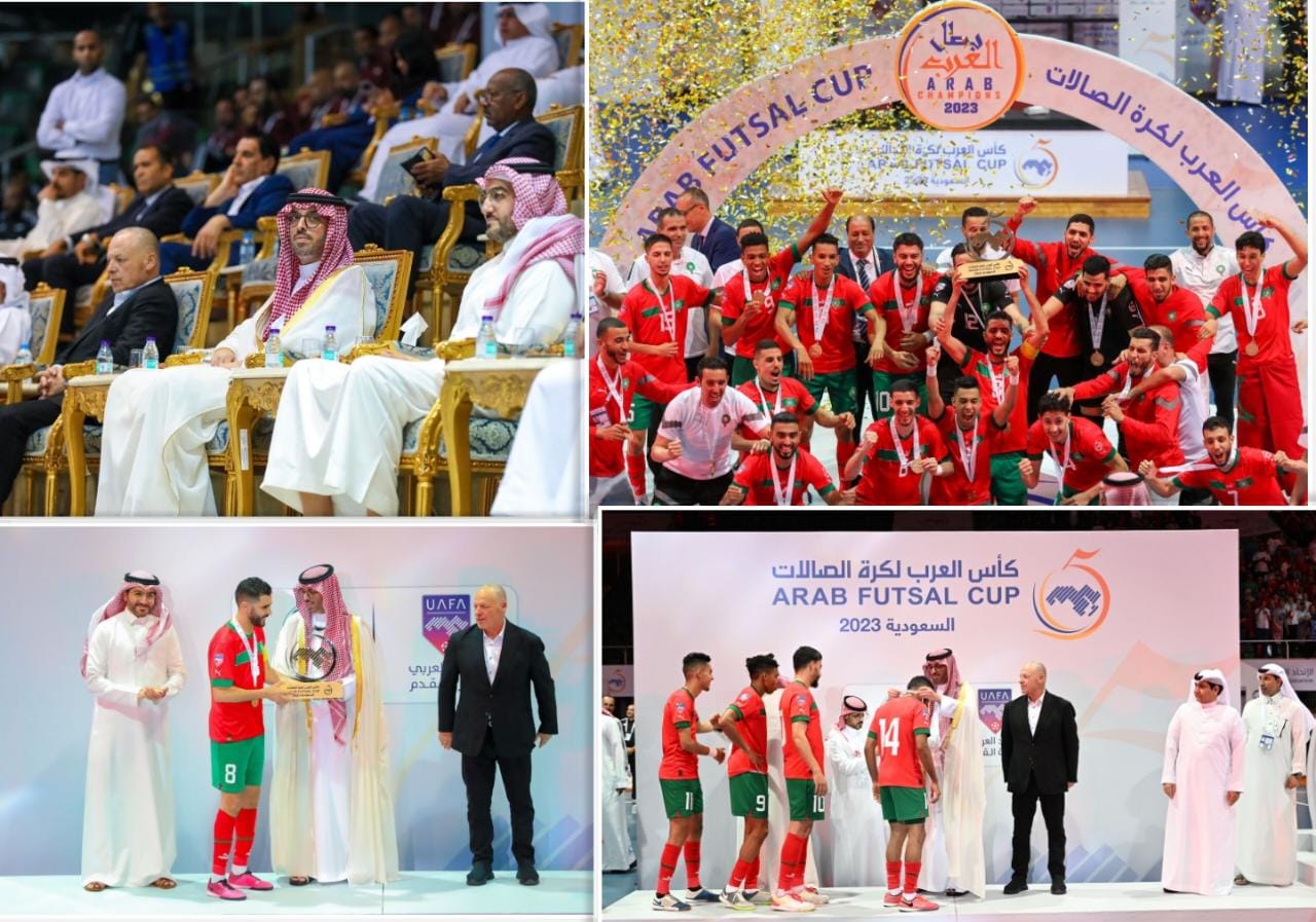 نيابةً عن صاحب السمو الملكي الأمير خالد بن فيصل بن عبدالعزيز، مستشار خادم الحرمين الشريفين، أمير منطقة مكة المكرمة، توّج صاحب السمو الأمير سعود بن عبدالله بن جلوي محافظ جدة اليوم، منتخب المغرب بكأس بطولة العرب لكرة قدم الصالات 2023 في نسختها السابعة، بعد فوزه في المباراة النهائية على منتخب الكويت بنتيجة 7-1 في اللقاء الذي جمعهما على صالة وزارة الرياضة بجدة.