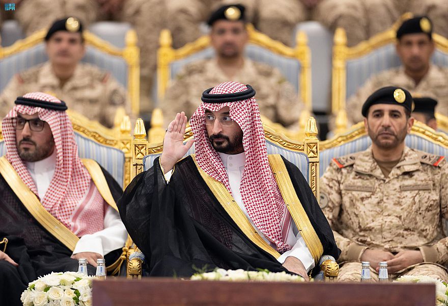 وكان في استقبال سموه لدى وصوله مقر الحفل بمركز تدريب الحرس الوطني بالقطاع الغربي، رئيس الجهاز العسكري بالوزارة المكلف اللواء الركن محمد بن زيد القحطاني ومساعد وكيل الحرس الوطني للجهاز العسكري بالقطاع الغربي اللواء الركن عبدالله بن علي التويجري، وعدد من قادة ورؤساء ومدراء الهيئات والإدارات، ثم عُزف السلام الملكي.