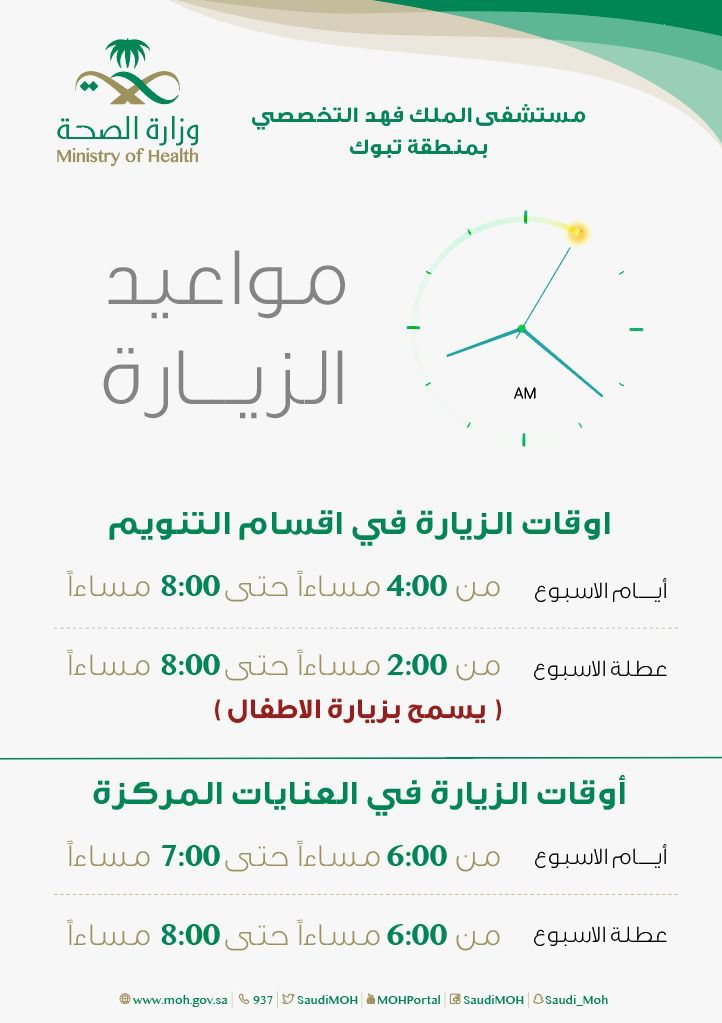 أعلن مستشفى الملك فهد التخصصي بتبوك عن تغيير مواعيد زيارة المرضى المنومين اعتبارا من اليوم الأحد 11 محرم 1445هـ الموافق 29 يوليو 2023م , حيث أصبحت الزيارة متاحة طوال أيام الأسبوع من الأحد الى الخميس من الساعة 4 مساء و حتى 8 مساء , أما أقسام العناية المركزة فستكون الزيارة من الساعة 6 مساء و حتى 7 مساء .