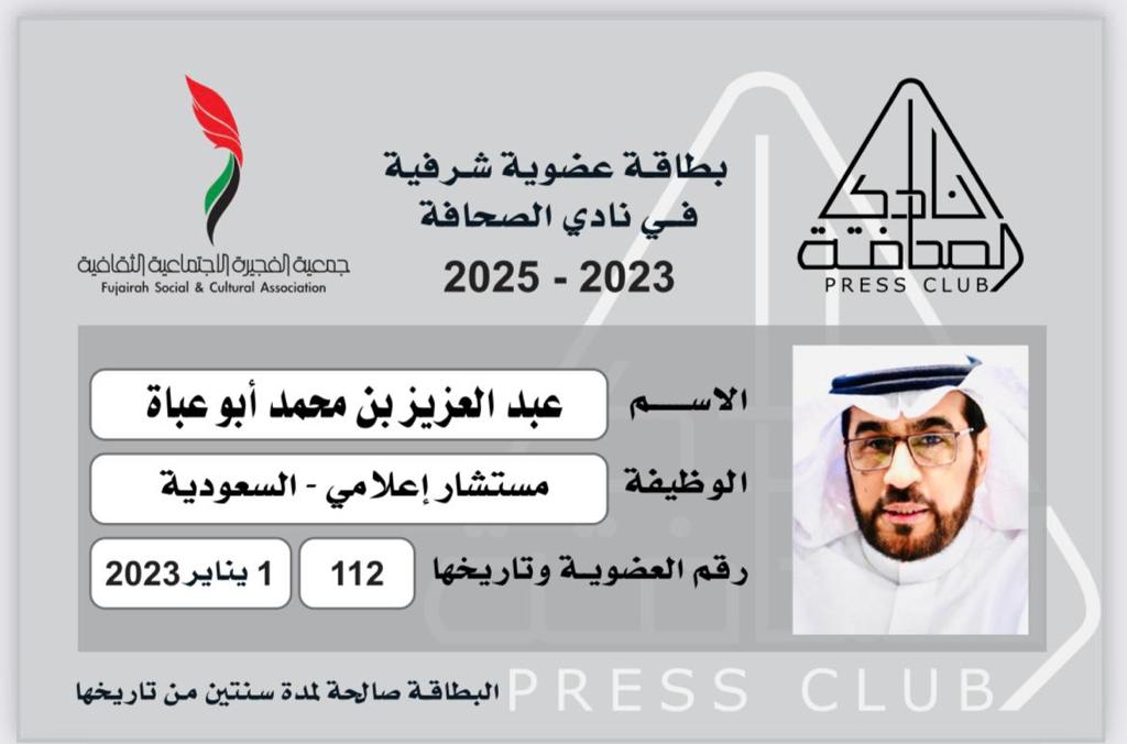 حصل الكاتب والمستشار الاعلامي الاستاذعبدالعزيز بن محمد أبوعباة على العضوية الشرفية لنادي الصحافة التابع لجمعية الفجيرةالثقافية الاجتماعية بدولة الامارات العربية وبهذة المناسبة يتقدم نادي الصحافة
