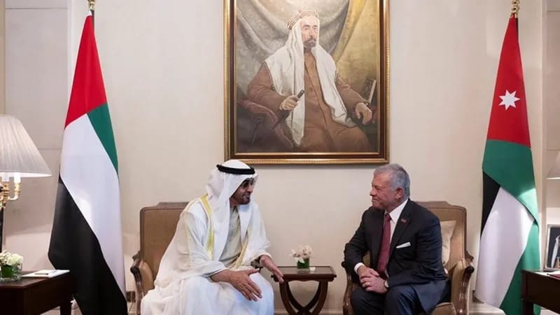 بحث الشيخ محمد بن زايد آل نهيان، رئيس الإمارات، والعاهل الأردني الملك عبد الله الثاني بن الحسين، العلاقات بين البلدين وإمكانات تعزيز التعاون الاستراتيجي والعمل المشترك بما يحقق مصالحهما المتبادلة، إضافة إلى مجمل القضايا الإقليمية والدولية محل الاهتمام المشترك.