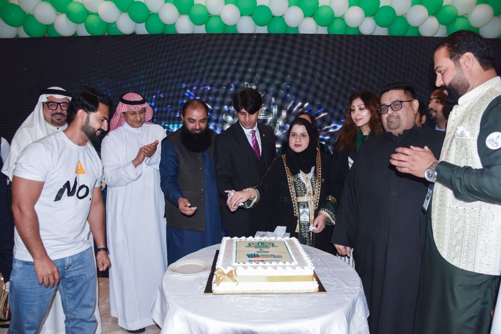 والإعلاميات والفنانين والفنانات المشاركين في الحفل، وتم قطع الكيكة المعدة بهذه المناسبة السعيدة بمناسبة اليوم الوطني لباكستان