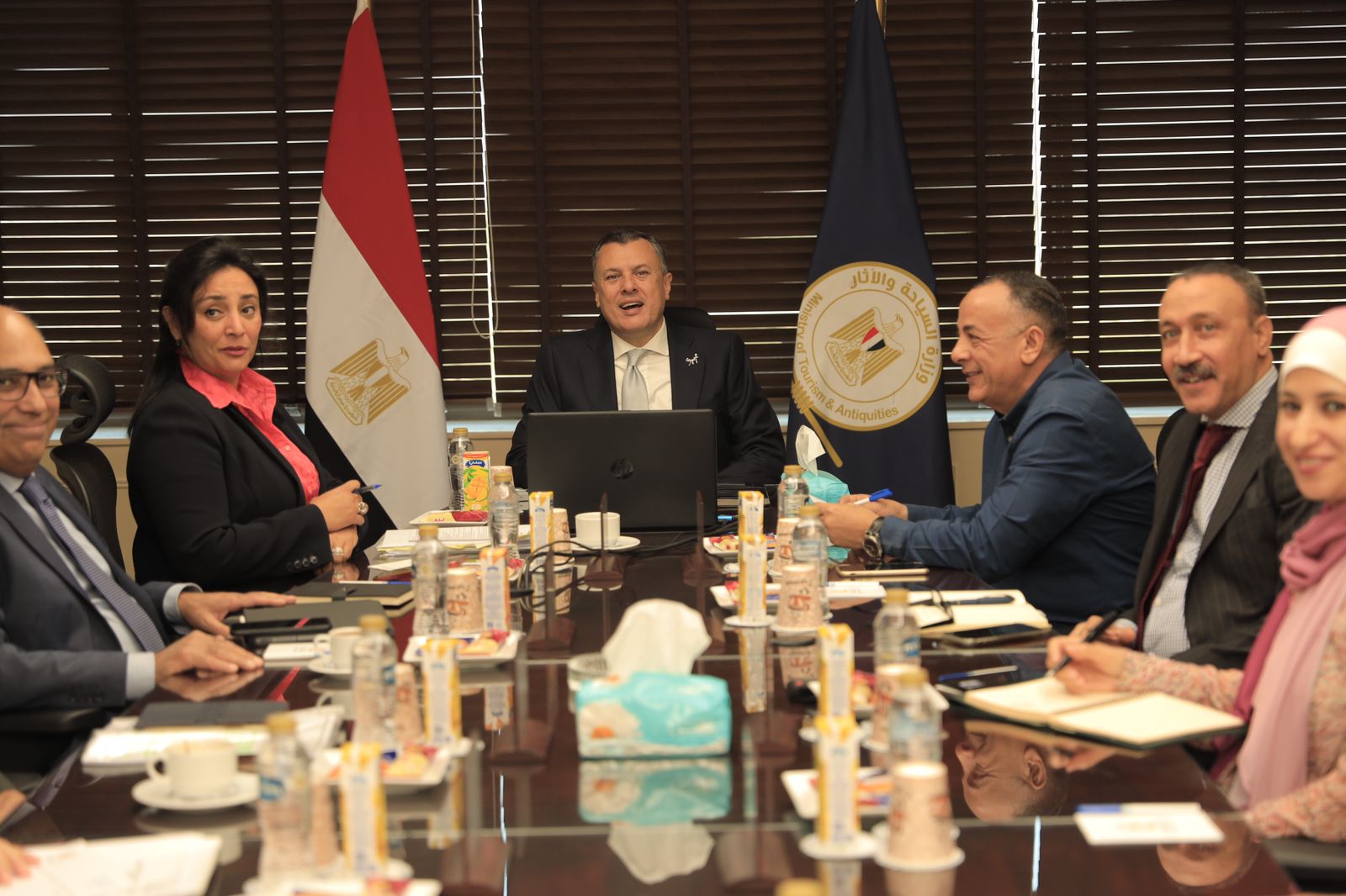 وقد شارك في حضور الاجتماع الأستاذة غادة شلبي نائب الوزير لشئون السياحة، والدكتور مصطفى وزيري الأمين العام للمجلس الأعلى للآثار، والسيد عمرو القاضي الرئيس التنفيذي للهيئة المصرية العامة للتنشيط السياحي، ومساعدي الوزير لكل من شئون الديوان والوكيل الدائم للوزارة، مشروعات الآثار والمتاحف، للشئون الفنية وشئون مكتب الوزير، للتحول الرقمي، للشئون المالية والاستثمار، ورئيس الإدارة المركزية للمنشآت الفندقية والمحال والأنشطة السياحية بالوزارة، ومعاون الوزير للطيران والمتابعة.