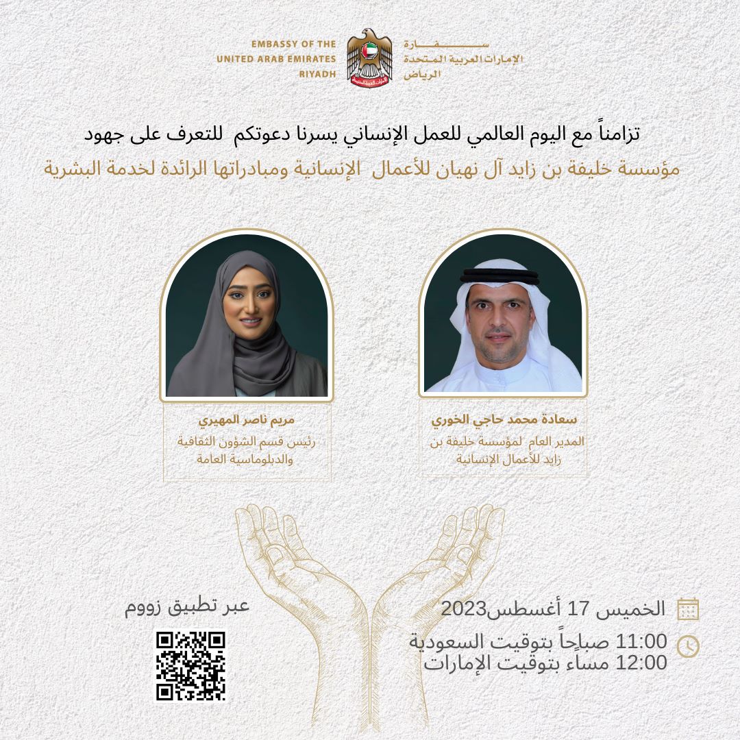 عقدت سفارة دولة الإمارات العربية المتحدة لدى المملكة العربية السعودية جلسة حوارية افتراضية بالتزامن مع الاحتفال باليوم العالمي للعمل الانساني الذي يصادف ال١٩ اغسطس من كل عام، حيث يأتي احتفال هذا العام تحت شعار “نقف معا مهما كان”. إذ استضافت الأستاذة مريم المهيري رئيس قسم الشؤون الثقافية والدبلوماسية العامة في السفارة سعادة محمد حاجي الخوري المدير العام لمؤسسة خليفة بن زايد آل نهيان للأعمال الإنسانية.