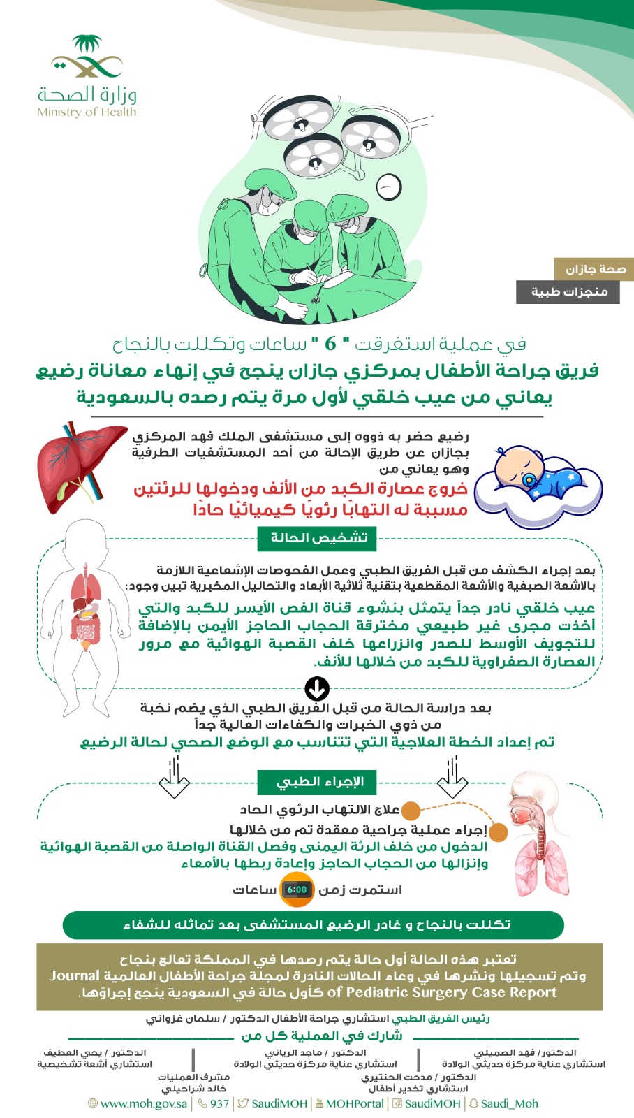 الجدير بالذكر بأن هذه العملية شارك فيها كلاً من الدكتور فهد الصميلي -استشاري عناية مركزة حديثي الولادة ، والدكتور ماجد الرياني استشاري عناية مركزة حديثي الولادة والدكتور يحي العطيف استشاري أشعة تشخيصية و الدكتور مدحت الحنتيري استشاري تخدير أطفال وكذلك مشرف العمليات خالد شراحيلي ، اذ نجحوا في إنهاء معاناة هذا الرضيع ورصد هذا العيب الخلقي النادر كأول حالة يتم رصدها في المملكة ونجاح علاجها ،وتم تسجيل الحالة ونشرها في وعاء الحالات النادرة لمجلة جراحة الأطفال العالمية Journal of Pediatric Surgery Case Report كأول حالة في السعودية ينجح إجراؤها .