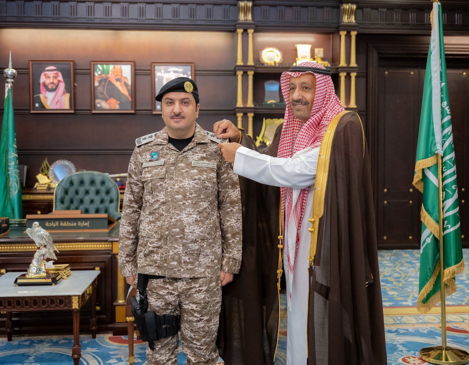 قلّد صاحب السمو الملكي الأمير الدكتور حسام بن سعود بن عبدالعزيز، أمير منطقة الباحة، قائد الحماية الخاصة المرافق لسمو أمير المنطقة العقيد عبدالله بن غرم الله الخثعمي رتبته الجديدة بعد صدور الأمر الملكي بترقيته لرتبة “عقيد” .
