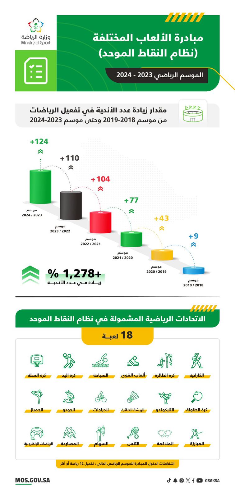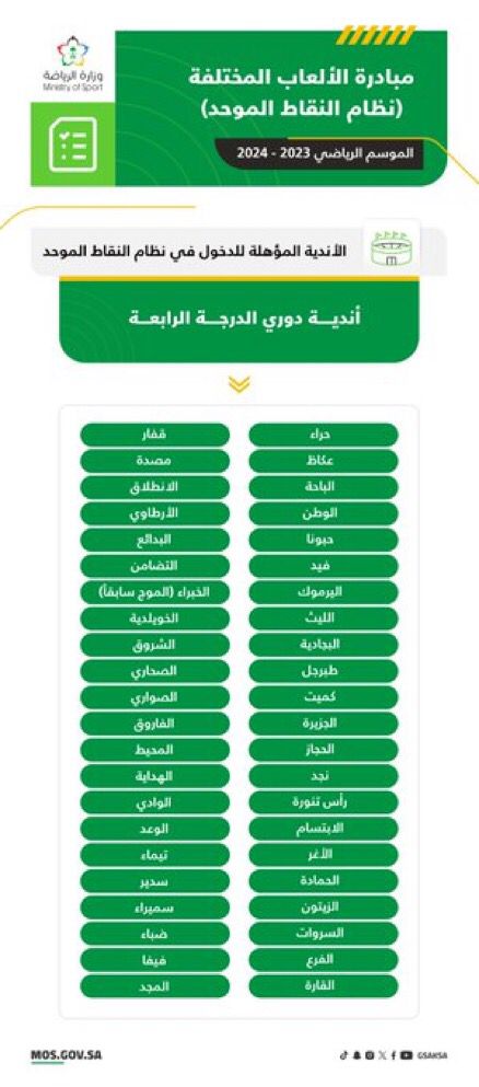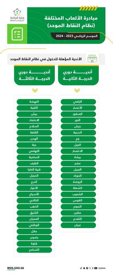 وزارة الرياضة تكشف عن الأندية المؤهلة للدخول في نظام النقاط الموحد، ضمن مبادرة الألعاب المختلفة في الموسم الخامس من استراتيجية دعم الأندية.