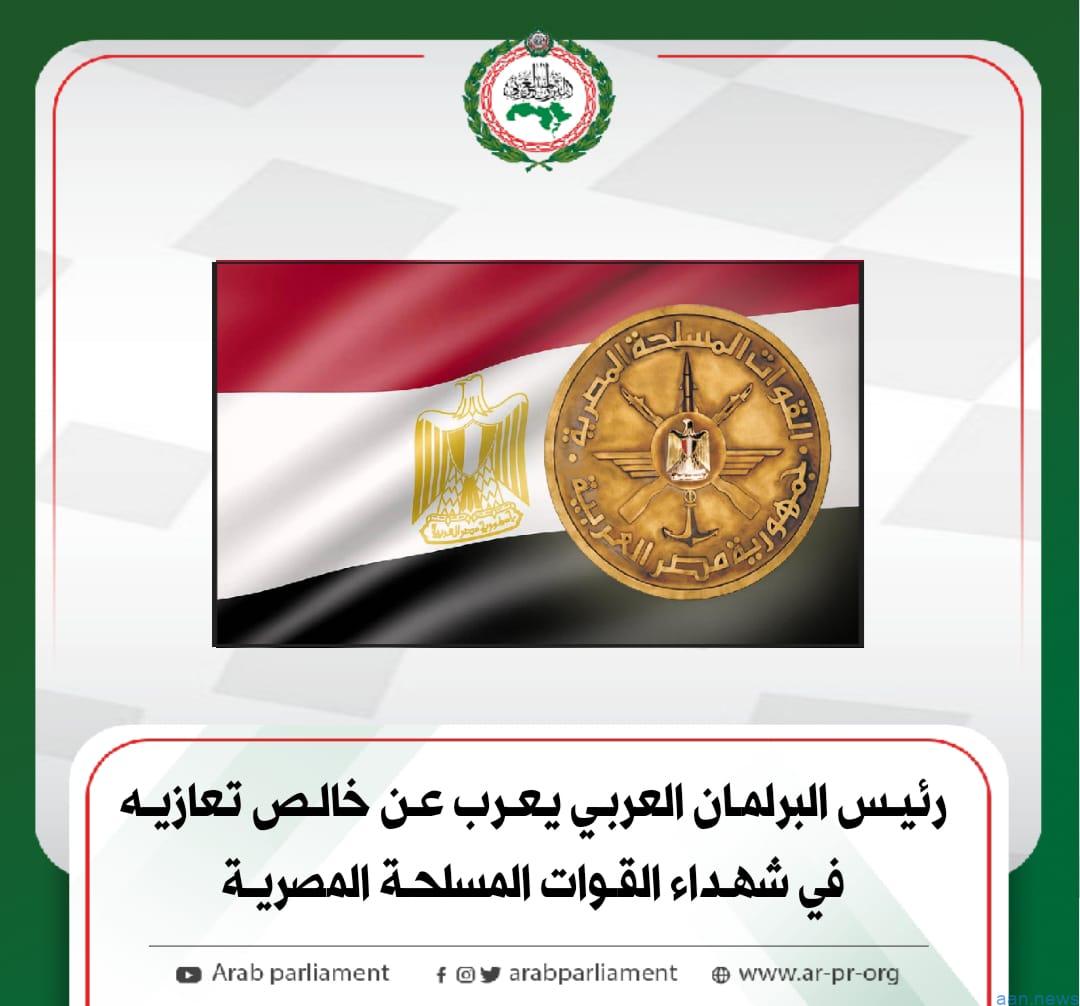 أعرب عادل بن عبدالرحمن العسومي رئيس البرلمان العربي، عن خالص التعازي وصادق المواساة لجمهورية مصر العربية قيادة وحكومة وبرلمانا وشعبا ولقواتها المسلحة في استشهاد وإصابة عدد 9 من الضباط والدرجات الأخرى بالقوات المسلحة المصرية، إثر تعرض إحدى الناقلات المحملة بالذخائر لحادث إنقلاب مفاجئ، أثناء قيام إحدى الوحدات المختصة بالإمداد بالذخائر بمنطقة الروبيكى جنوب مدينة العاشر من رمضان بأنشطة تدريبية.