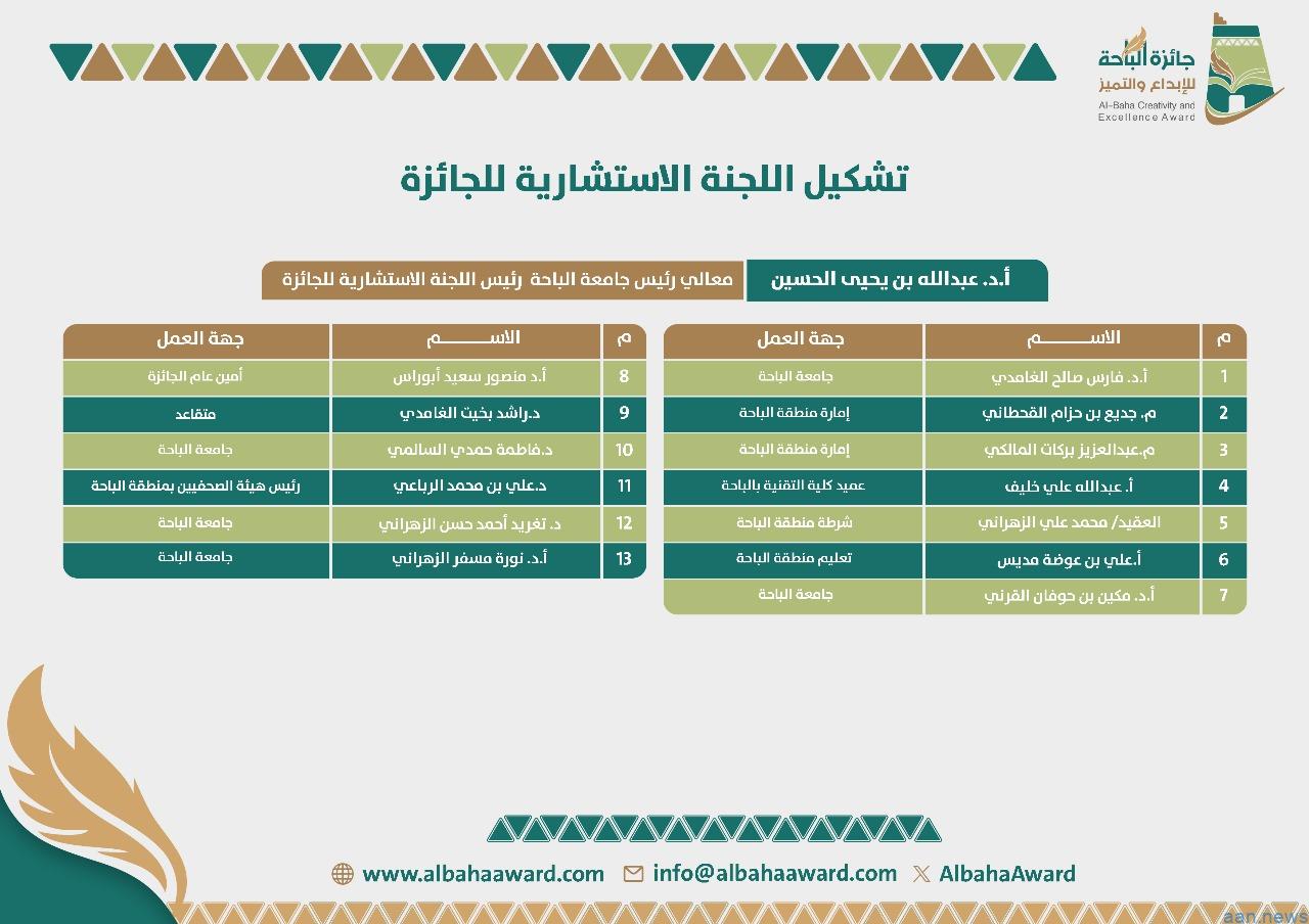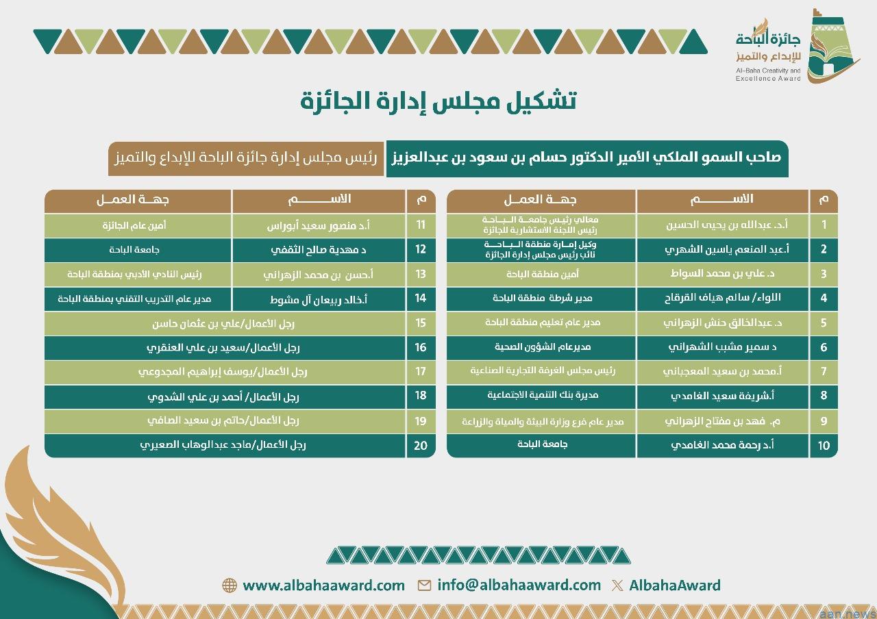 اعتمد صاحب السمو الملكي الأمير الدكتور حسام بن سعود بن عبدالعزيز أمير منطقة الباحة رئيس مجلس إدارة جائزة الباحة للإبداع والتميُّز، تشكيل مجلس إدارة الجائزة في نسختها التاسعة بعضوية 20 عضواً مع اعتماد تشكيل اللجنة الاستشارية برئاسة معالي رئيس جامعة الباحة الأستاذ الدكتور عبدالله بن يحيى الحسين .