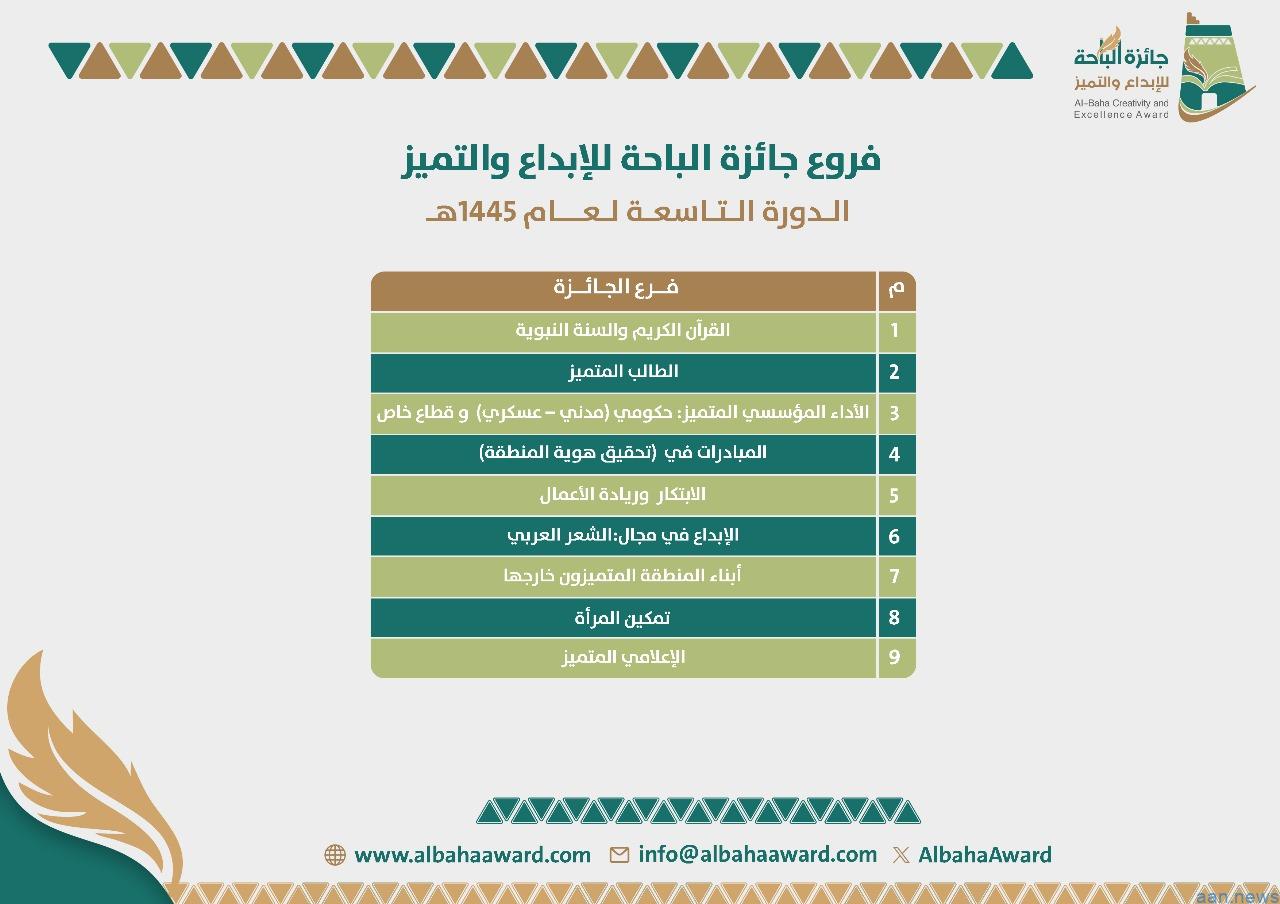 من جانبه أوضح أمين عام الجائزة الأستاذ الدكتور منصور بن سعيد أبوراس أن فروع جائزة الباحة للإبداع والتميز في دورتها التاسعة ستشمل فرع القرآن الكريم والسنة النبوية، وفرع الطالب المتميز، وفرع الأداء المؤسسي المتميز من القطاع الحكومي (مدني – عسكري) والقطاع الخاص، وفرع المبادرات في تحقيق هوية المنطقة، وفرع الإبداع في مجال الشعر العربي، وفرع أبناء المنطقة المتميزون خارجها، وفرع تمكين المرأة، وفرع الإعلامي المتميز.