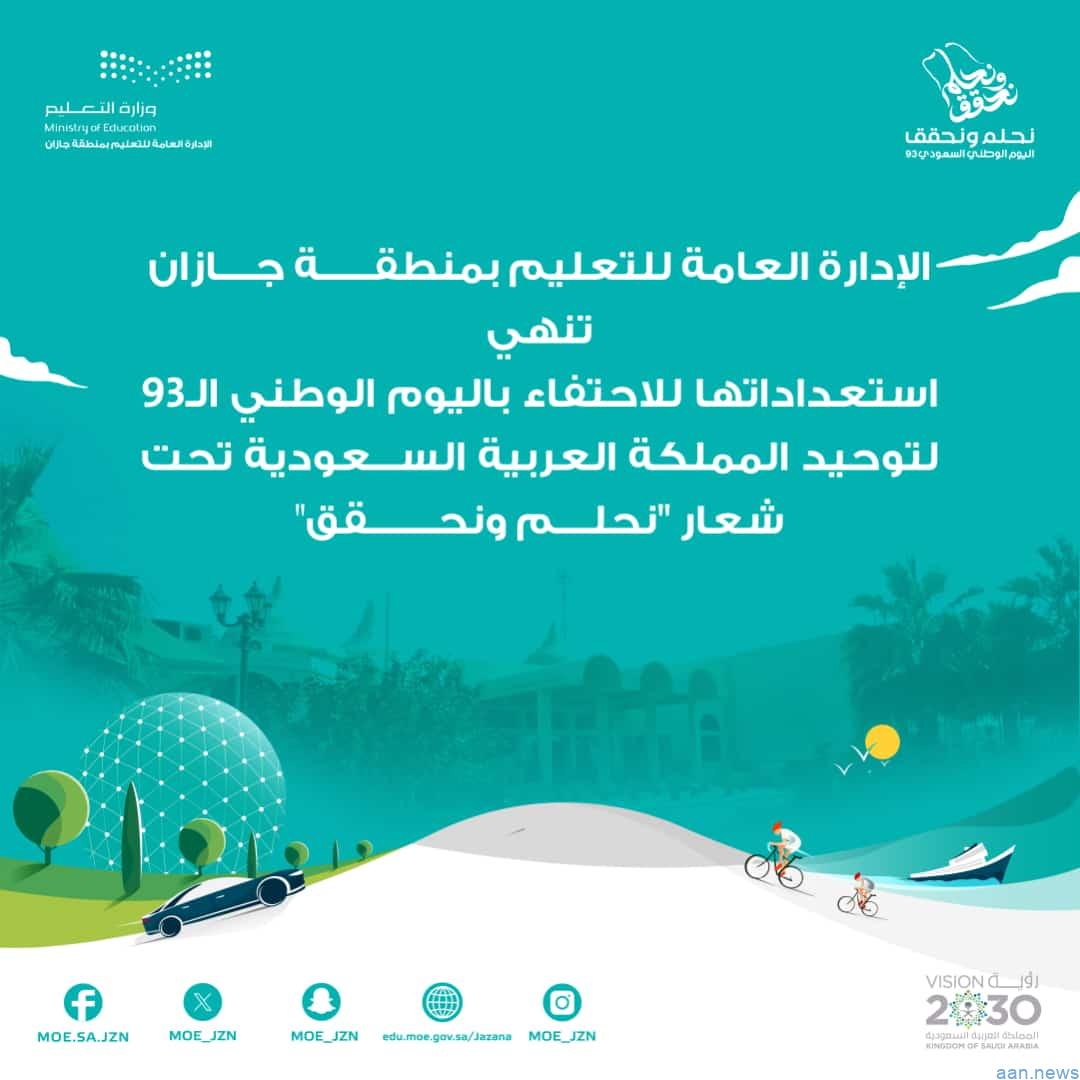 تحت شعار ‎#نحلم_ونحقق.. ‎#تعليم_جازان ينهي استعداداته للاحتفاء باليوم الوطني الـ93 بأكثر من 71 فعالية.