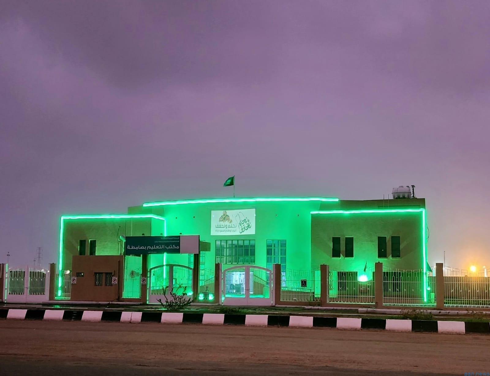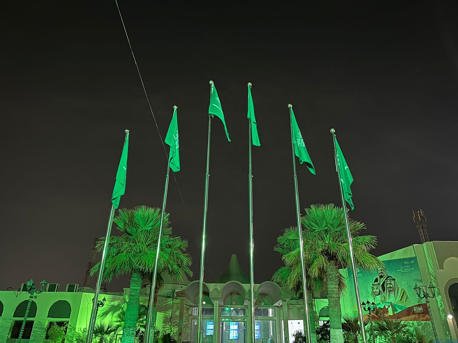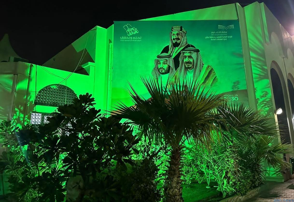 وازدانت المباني باللون الأخضر الذي يرمز إلى السلام والاستقرار والتطور، والمعبر عن حب الوطن والولاء لقيادته، عبر عدد من الإضاءات الديكورية والليزرية الخضراء، وعلت ورفرفت راية العز خفّاقة بفخر فوق أسوارها وداخل ساحاتها، مجسّدة العمق التاريخي لهذا الوطن العظيم، ورامزة لهويتنا الإسلامية التي نفتخر بها، وما يحظى به المواطن السعودي من عزّة ومكانة وكرامة، فيما عكست صور القيادة الرشيدة وملوك المملكة العربية السعودية الذين ساهموا في بناء هذا الوطن وصنع تاريخه، والتي ازدانت بها مباني تعليم جازان روح الوحدة والانتماء الوطني الذي يجمع الشعب وقيادته الحكيمة.